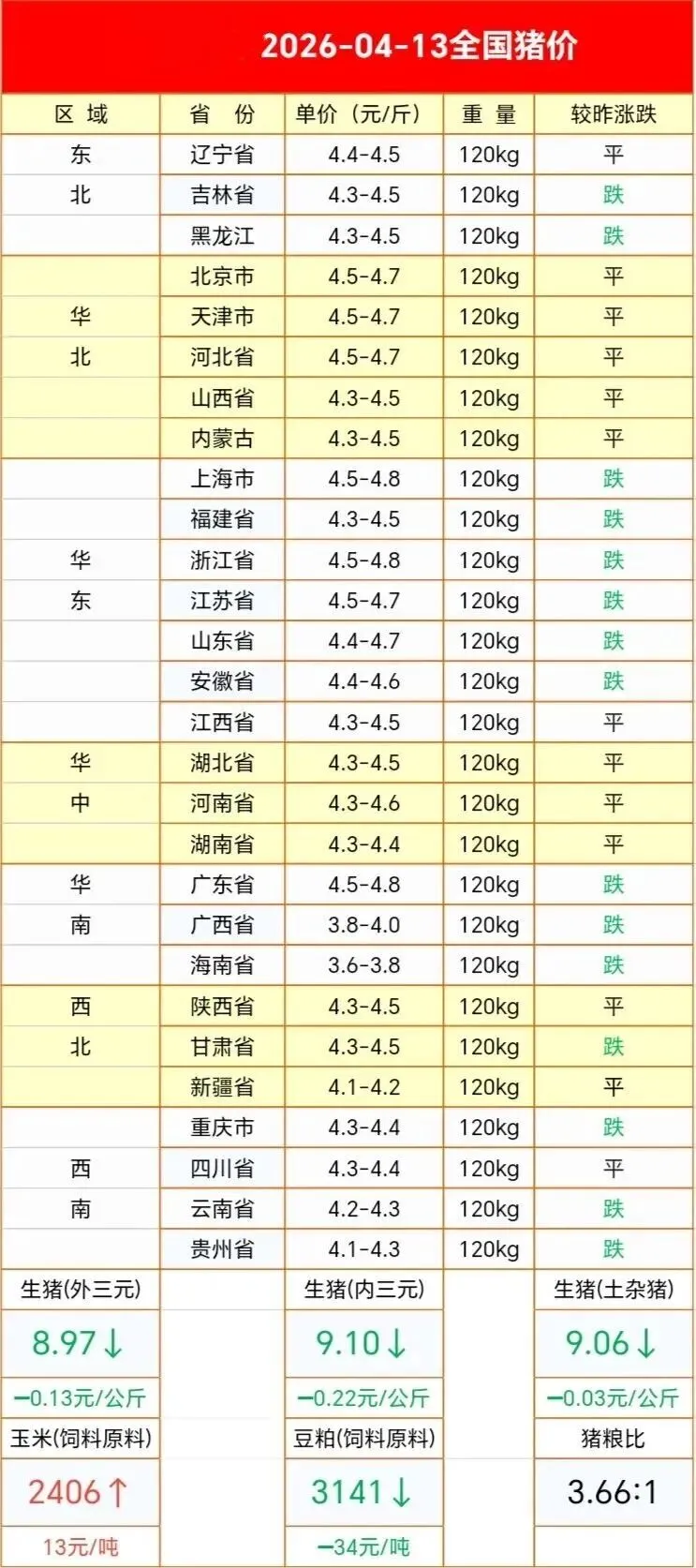 2026年4月13日全国生猪行情汇总:全国均价4.35-4.51元/斤,华北局部小幅上涨,抗价 + 收储托底,小幅震荡!