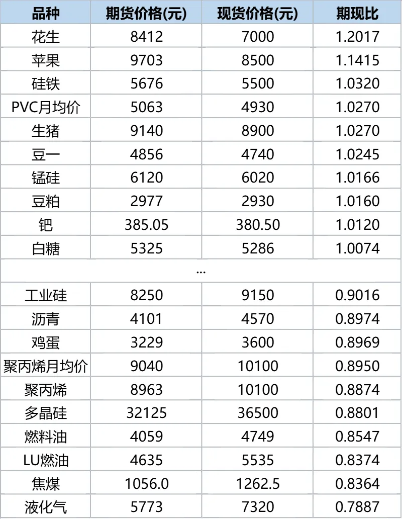 说明:期现比=期货主力合约价格/现货价格,大于1为期货升水,小于1为期货贴水。