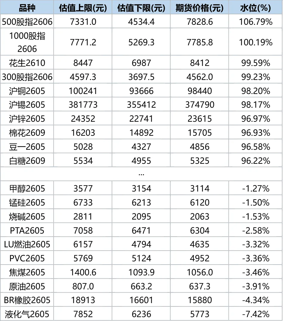 说明:估值上限、估值下限数据采自文华财经的多因子估值数据库,价格水位= 当前期货价格/估值数据,价格水位处于0值附近代表当前期货价格处于低位;价格水位处于100%附近代表当前期货价格处于高位。