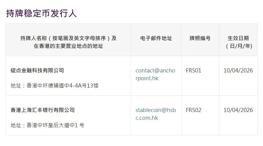 香港金融管理局宣布,金融管理专员根据《稳定币条例》向碇点金融科技有限公司及香港上海汇丰银行有限公司授予稳定币发行人牌照,以在香港发行稳定币。碇点金融科技有限公司由渣打银行(香港)、香港电讯和安拟集团共同组建。