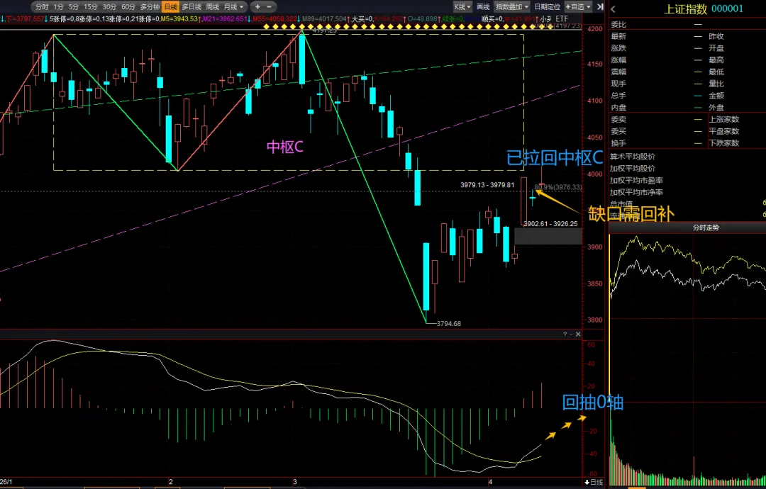 日线图,周五的高开缺口属于缩量普通缺口,这里是需要回补的。周五如愿拉回中枢C(中枢下轨4003),对于后市的走势图形是个好迹象。