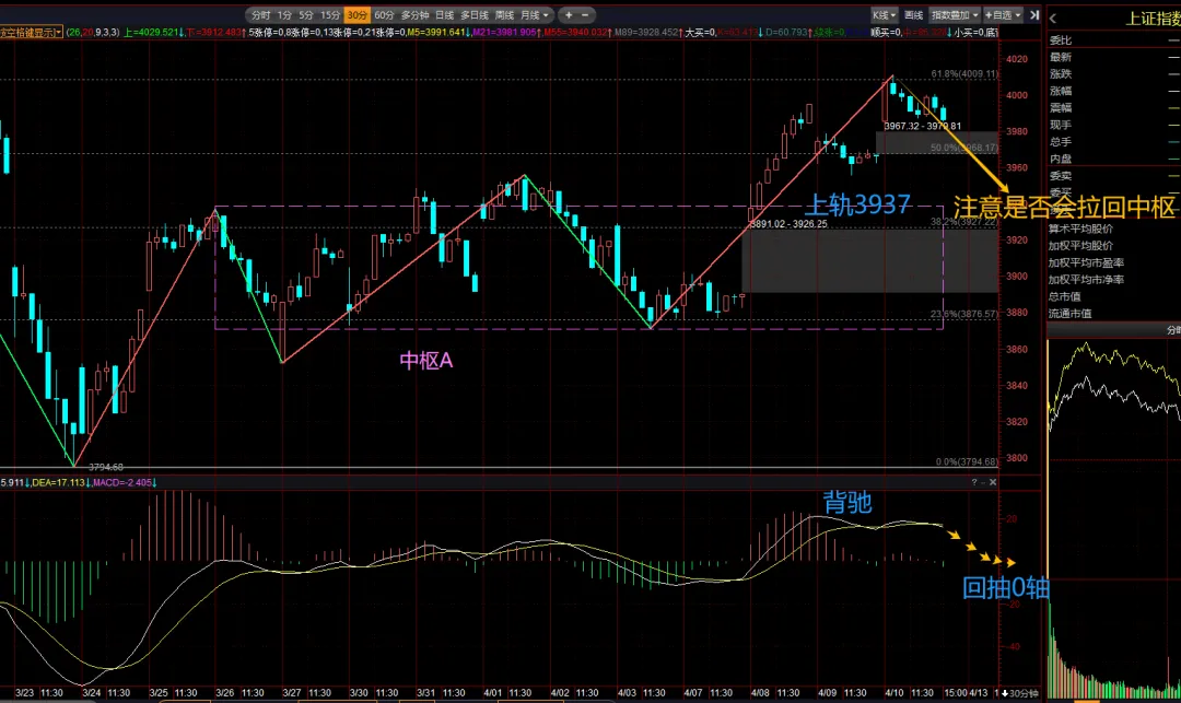 30分钟图,出现背驰且MACD死叉,动能衰减明显。这里需回调一笔,同时MACD回抽0轴重新蓄力,才能上攻。这里需注意是否会拉回3937,是判断向上趋势延续还是掉头向下的关键。