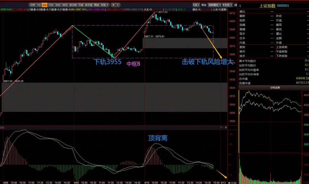 5分钟图,这里正在构造中枢B,注意不能击破下轨支撑的3955,否则风险增大。
