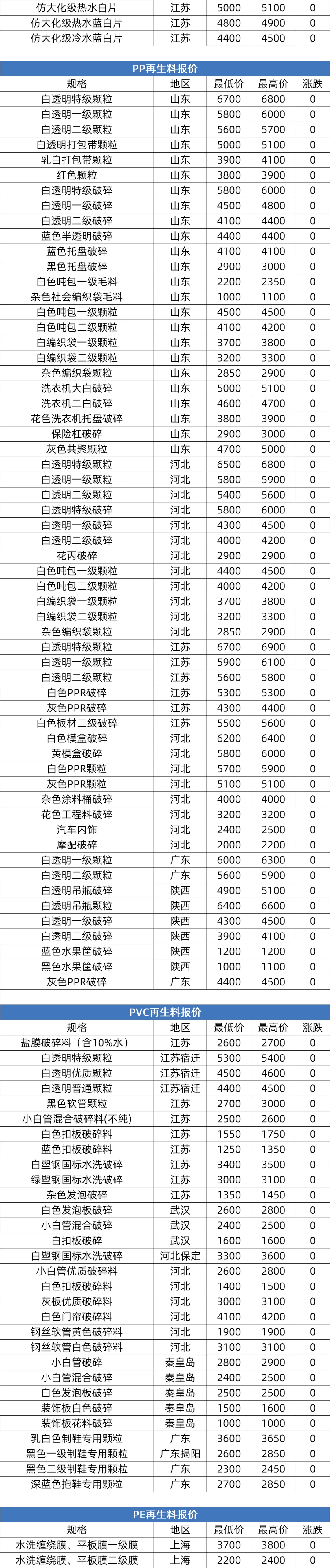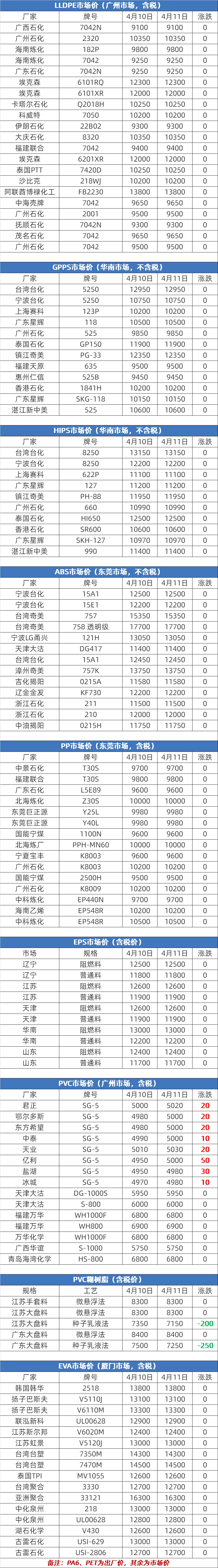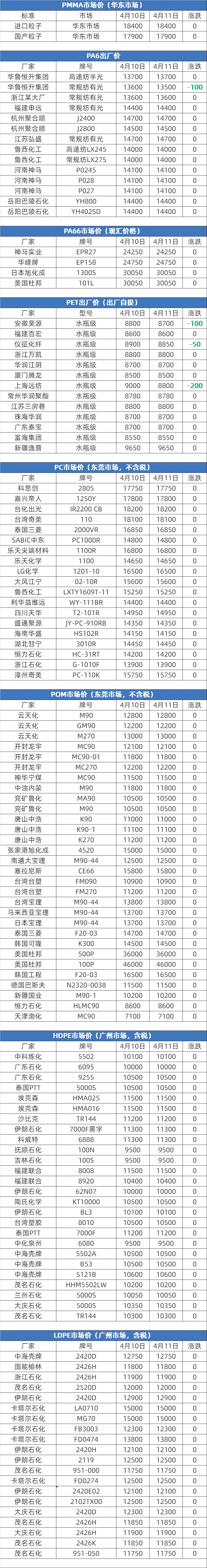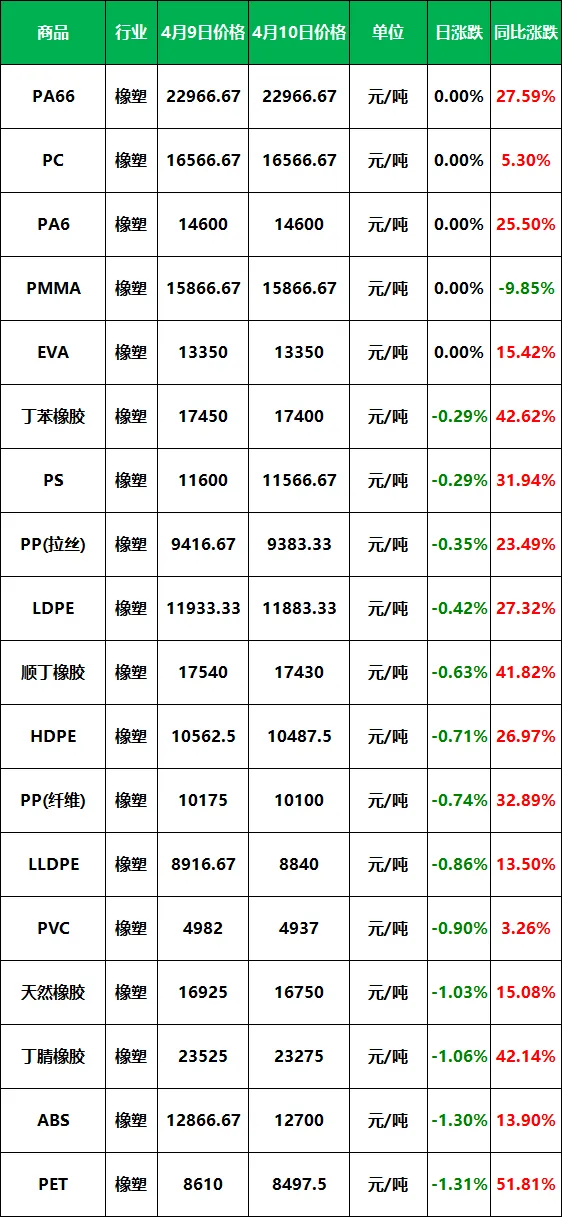2026年4月10日大宗商品价格涨跌榜中橡塑板块环比上升的商品共0种。