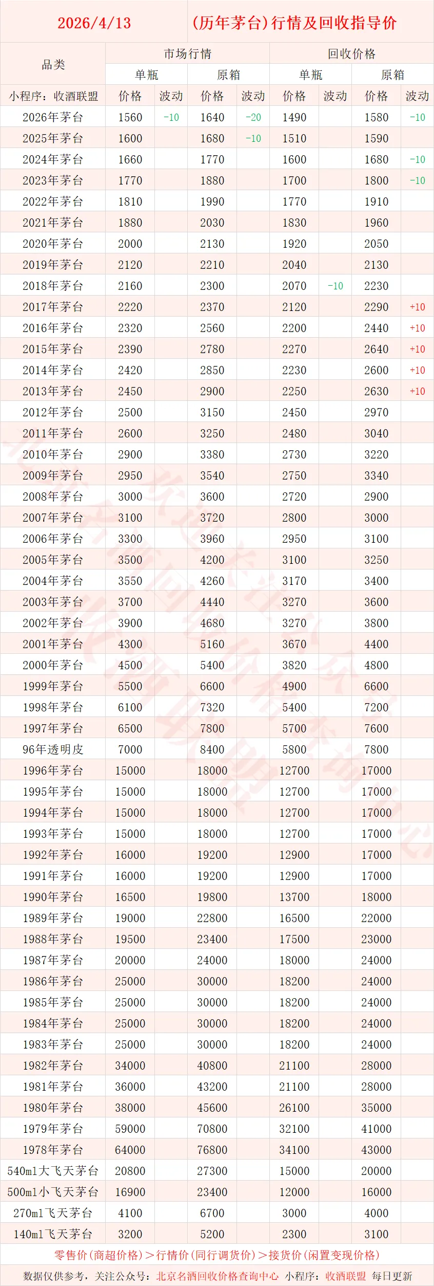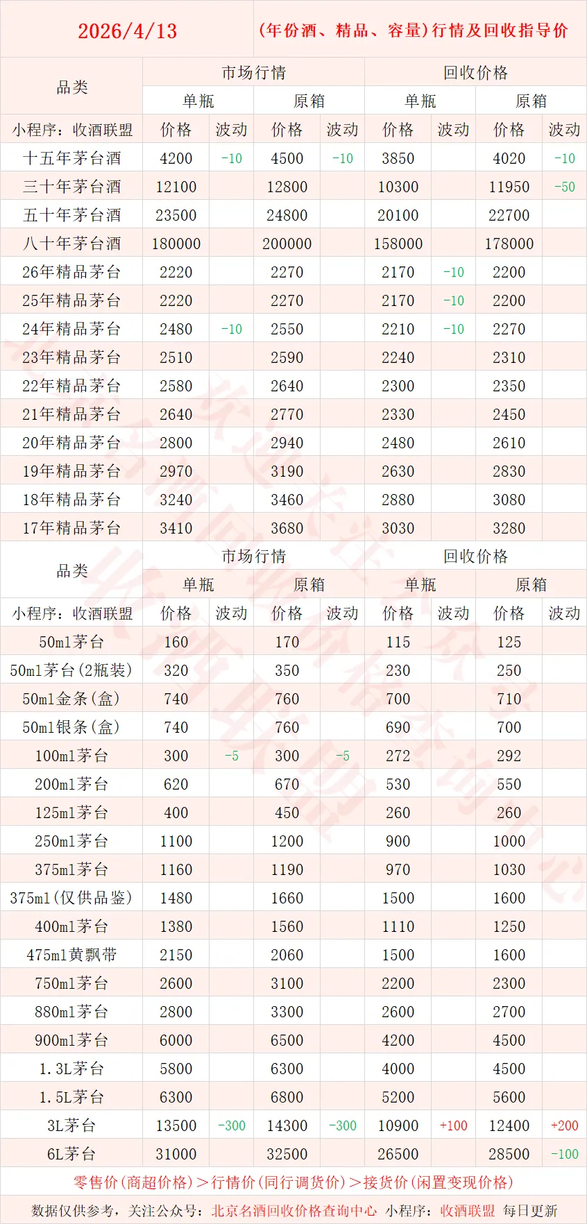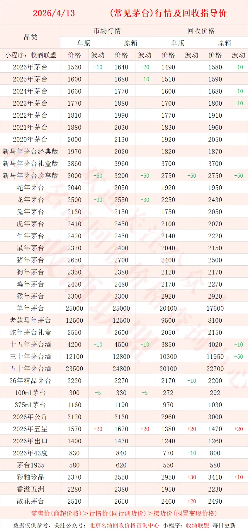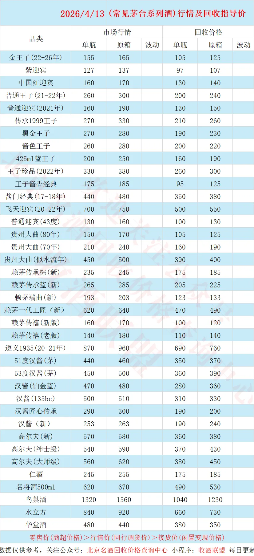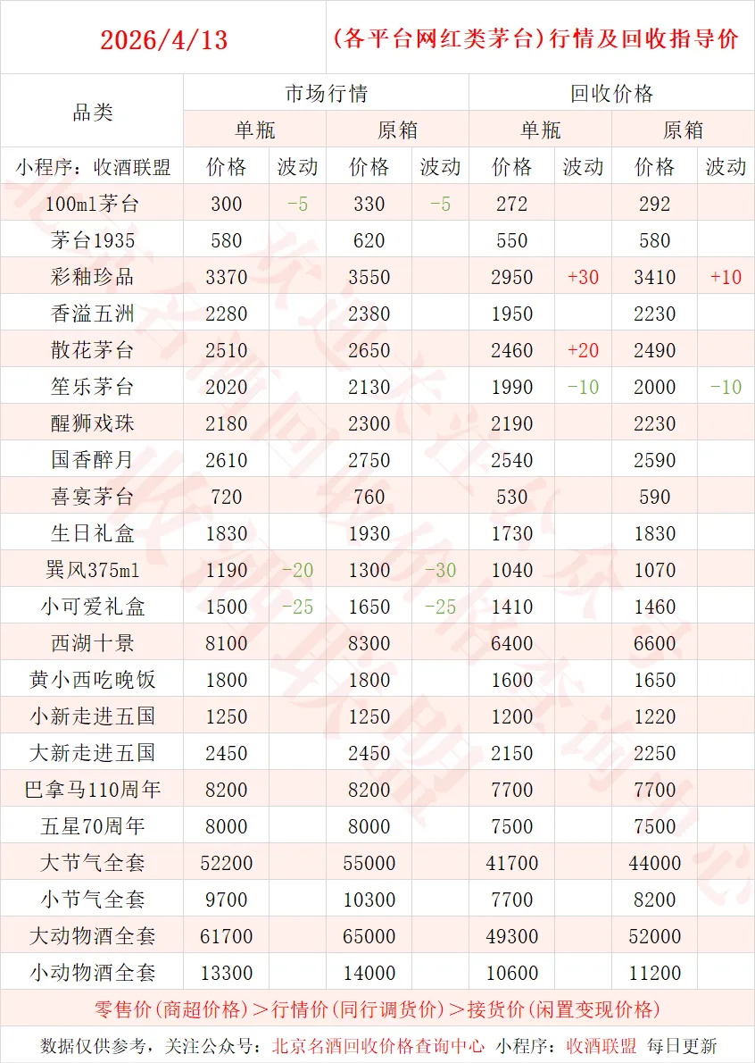 4月13日 茅台酒行情及名酒、红酒、洋酒一线回收参考价
