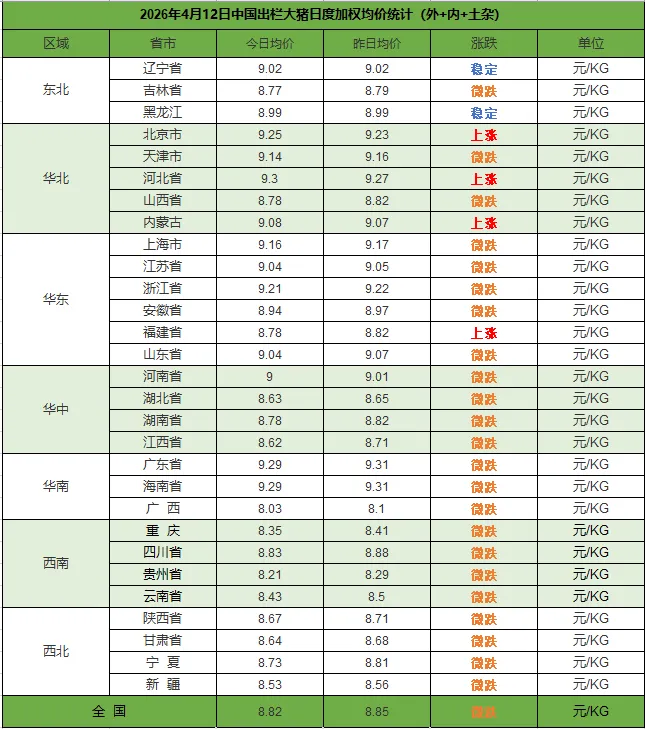 2026年4月12日,中国主流市场出栏外三元、内三元及土杂商品大猪加权日均价较昨日价格下跌,全国生猪出栏加权日均价8.82每公斤,较昨日价格下跌0.34%。猪粮比持续处于深度亏损区间,行业亏损严重。当前市场仍受生猪供应过剩、消费淡季需求疲软拖累,叠加饲料成本偏高,猪价反弹乏力,不过随着国家冻猪肉收储托底及五一节前备货预期逐步显现,短期继续大幅下跌空间有限,预计近期仍将低位震荡。今日全国外三元、内三元及土杂猪均价如下:1) 主流市场外三元大猪全国销售均8.93元每公斤,较昨天价格下跌0.27%;2)主流市场内三元大猪全国销售均价8.53元每公斤,较昨天价格下跌0.65%;3)主流市场土杂大猪全国销售均价8.16元每公斤,较昨天价格下跌0.30%。