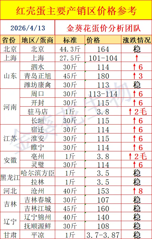2 0 2 6年 4月 13日全国鸡蛋主流价格