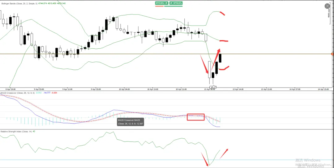 图中:随着一波小幅度的上升,布林带上轨和下轨已经呈现出了花苞形态的收口了,并且已经涨出了布林带的下轨了,MACD图中在经过一个不成功的死叉之后,快线处于在慢线的下面,慢线在上面,看布林带势头,如后续顺利的话,快线将冲出慢线形成金叉那么再次上升!RSI在早上跌入-30的超卖区并进行反弹,目前的势头是在迎风而上,结合以上3点指标都是一个对黄金好的势头!如后续顺利涨出4750,那就看4800吧!