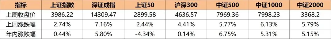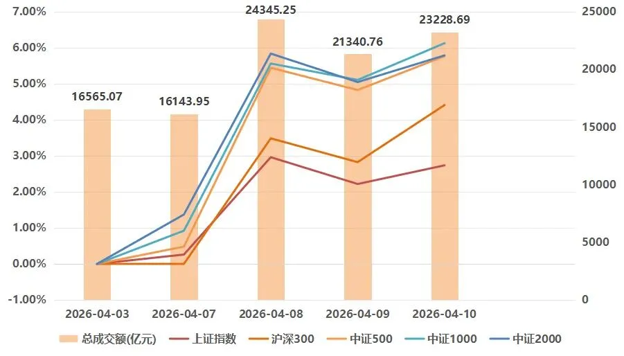 过去一周 (04/07-04/10),上证指数收盘价 3986.22,累计上涨2.74%;深证成指收盘价 14309.47,累计上涨7.16%。上证50 累计上涨 2.44%;沪深300 累计上涨 4.41%;中证500 累计上涨 5.77%;中证1000 累计上涨 6.13%;中证2000 累计上涨 5.79%。全A股日均成交量 21,264.66 亿元,较上上周增加 12.86%。