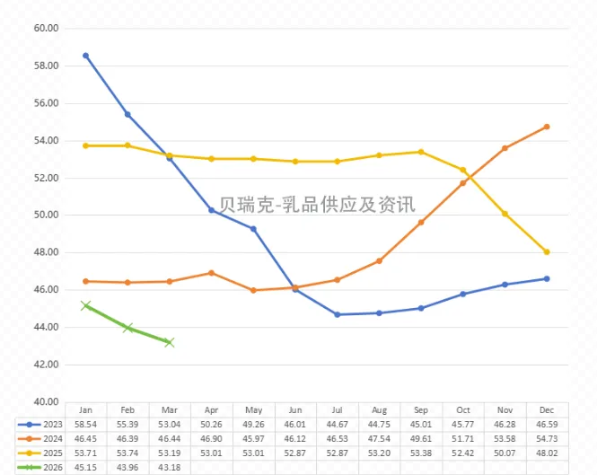 西欧鲜奶23-26年价格趋势图(欧分/kg)