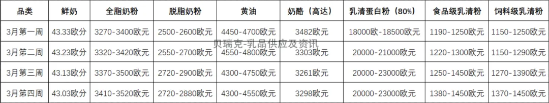 西欧三月份乳品类报价(工厂自提)
