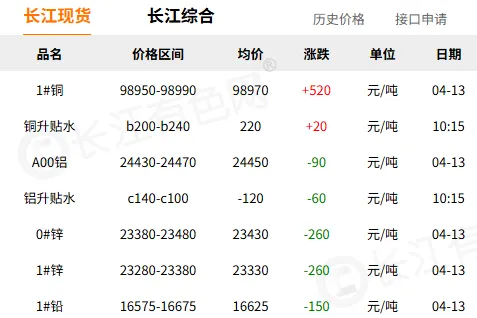 【今日铜价】04月13日长江有色1#铜行情播报