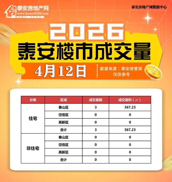【泰安房地产网讯】据本站不完全统计,2026年4月12日泰安市共成交商品房3套,其中住宅网签3套,总面积367.23㎡,与4月11日相比环比下降57.14%。