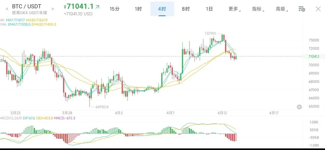比特币凌晨行情震荡下跌,最低到了70500附近,目前行情有所反弹。