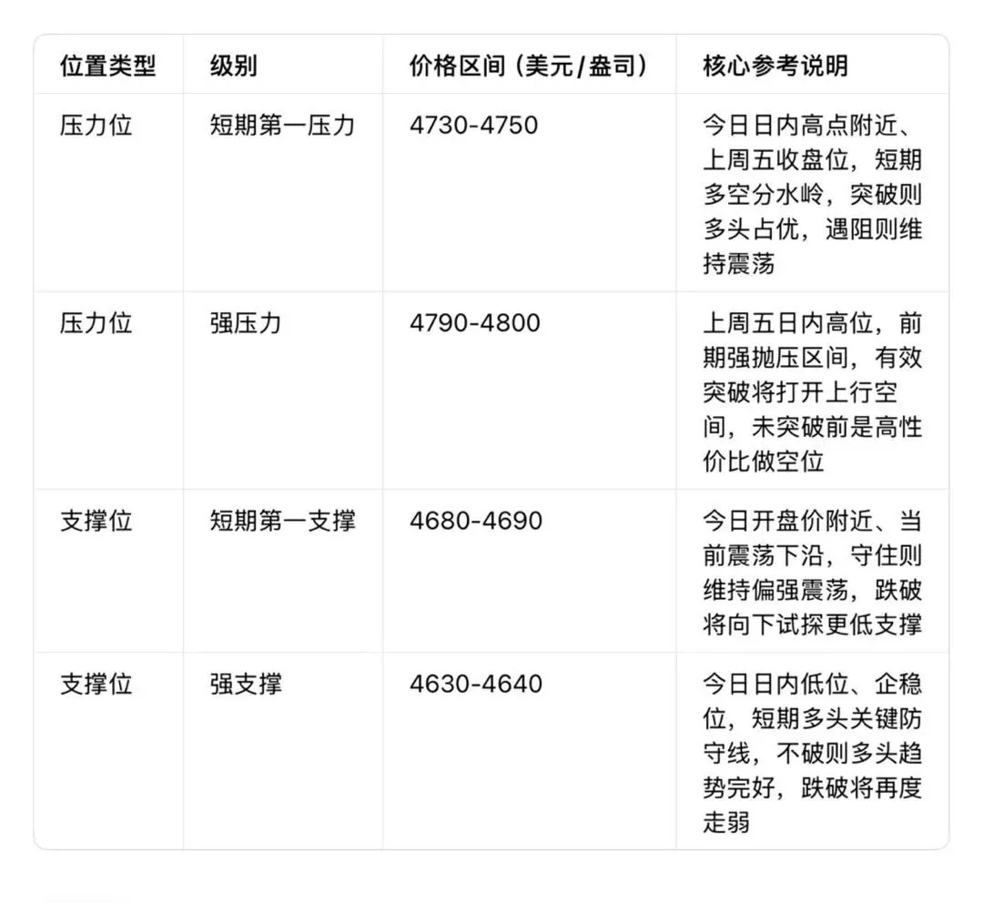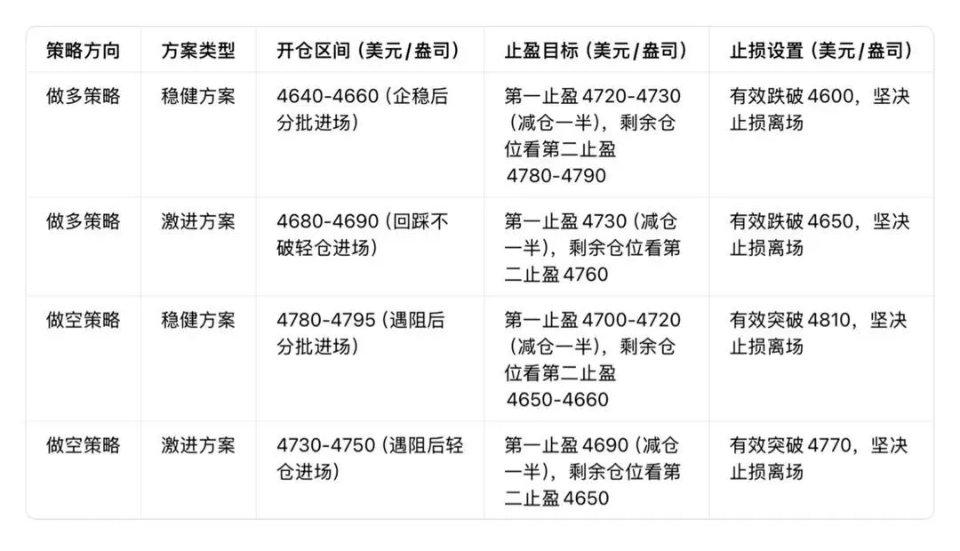 止盈目标:第一止盈4700-4720区间,减仓一半后,剩余仓位看第二止盈4650-4660区间
