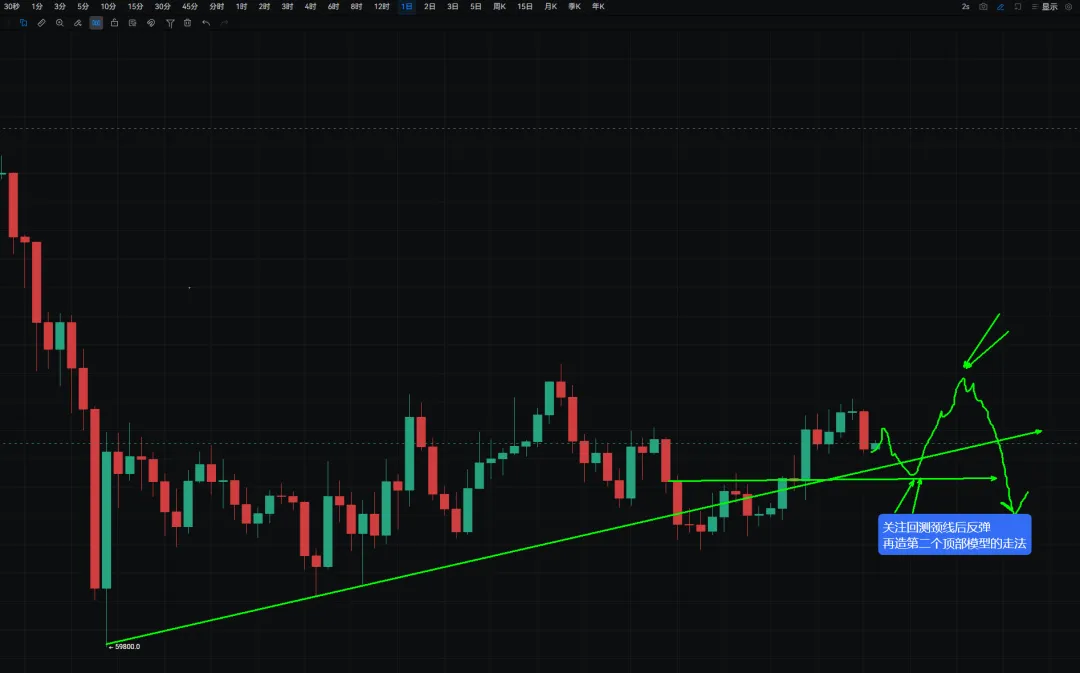 周末大饼的行情在我们上周五说的73600回调了,这里的大阴线直接把日线给砸出了顶部模型。虽然说日线有了顶部模型,但是往往行情 出现第一个这样的模型时候还不是最保险的,往往后面会出现第二个顶部模型才开始真正的下跌。并且临近我们之前判断的月中变盘节点,这里我们尽量用关键位的成功与否做跟随,少做主观的判断。