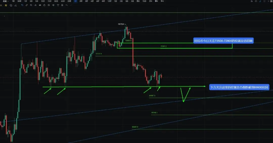 $BTC 大饼的压力位在72500-72800之间,这里没有回调下去的话要留意继续冲高,下方支撑先关注一下69900是否会假跌破到这里获取流动性再反弹的走法。