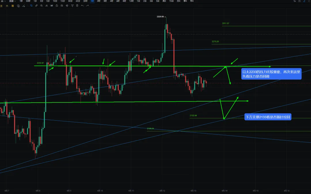 $ETH 以太今天先看2233的压力何时能够上去,这里之前做了多次支阻互换,再次上去的话压力在2275。下方关注是否会插针到2133反弹。