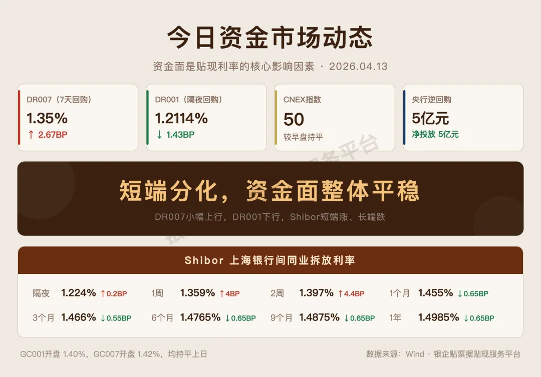 今日票据市场整体平稳运行。资金面出现短端分化信号——DR007小幅上行、DR001下行,Shibor呈现短涨长跌格局,CNEX指数恰好触及50荣枯线,资金面维持中性。转贴现利率较昨日收盘多数下行1–3BP,直贴利率维持低位,是近期贴现成本相对适中的窗口。一、今日资金市场动态
