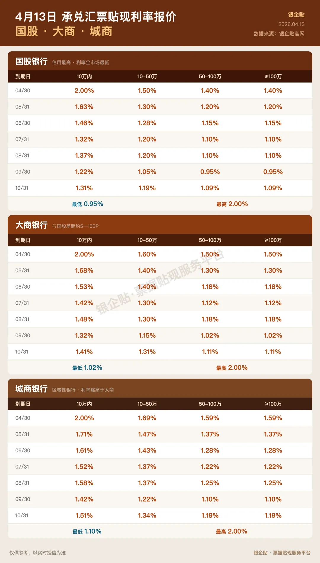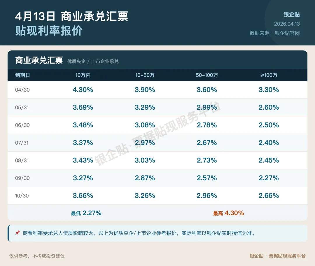 利率每日波动,以上为午间参考报价,实际成交以当日询价为准。告诉我们票据类型(银票/商票)、承兑行/承兑企业、票面金额、到期日,即可获得实时报价,1分钟资金到账。