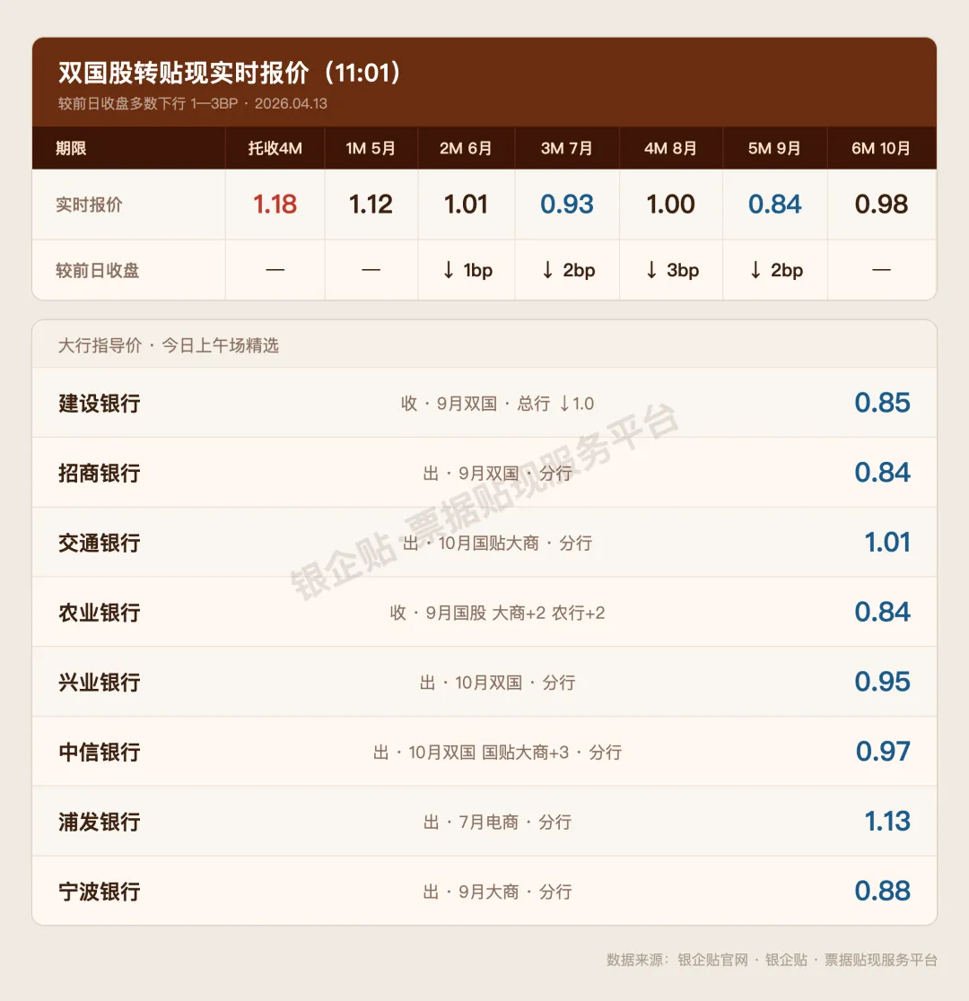 商票由企业自身承兑,利率显著高于银票,且承兑企业资质是能否成交的关键门槛。优质央企、国资上市公司开出的商票,成交相对顺畅;普通民营企业商票则可能直接无法成交。四、转贴现市场午间播报