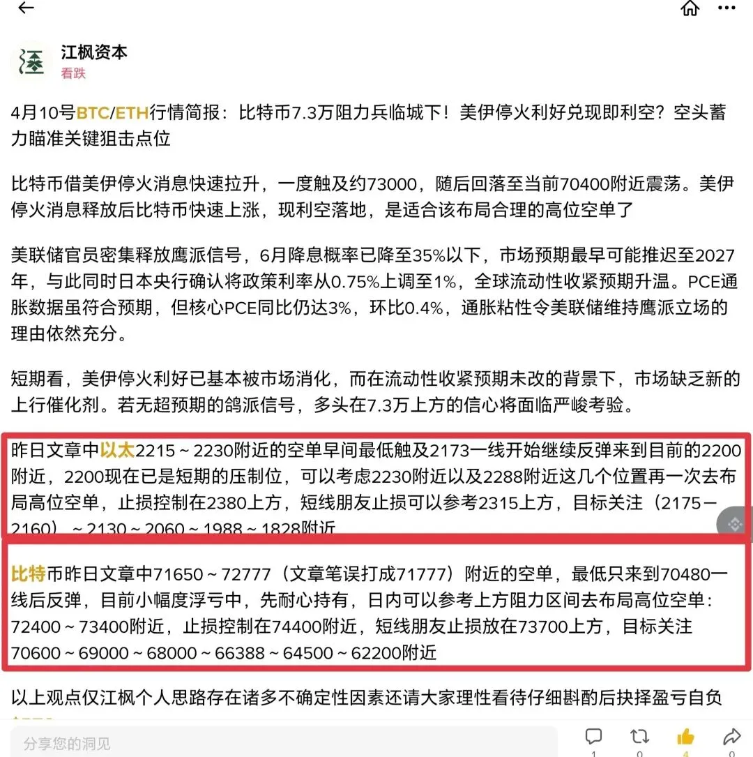 上周五我们文章中提到比特币72400~73400附近的空单最高冲至73799附近后开始走回撤,来到今日的70500一线,期间也是有几千点的利润空间的,以太同样也给到到2230~2288的空单,周末冲高至2329后开始走回撤,今日也来到2173附近后开始继续走反弹,期间利润空间不知道大家把握多少?接下来我们继续开启本周的行情分析思路!