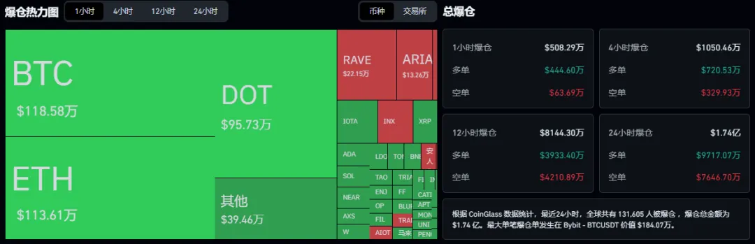 过去24小时全网共有131,605人被被爆仓,爆仓总金额为$1.74亿美元,多单爆仓9717.07万美元,空单爆仓7646.70万美元。📊 主流币表现: