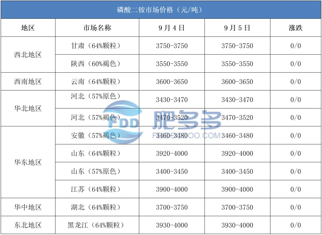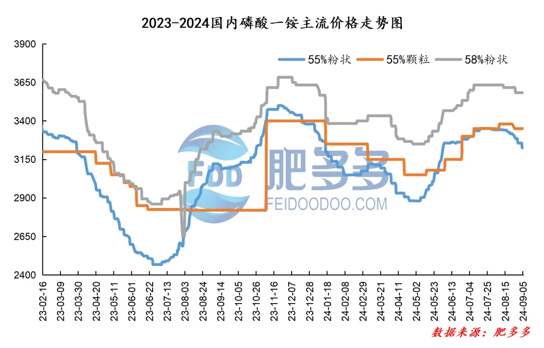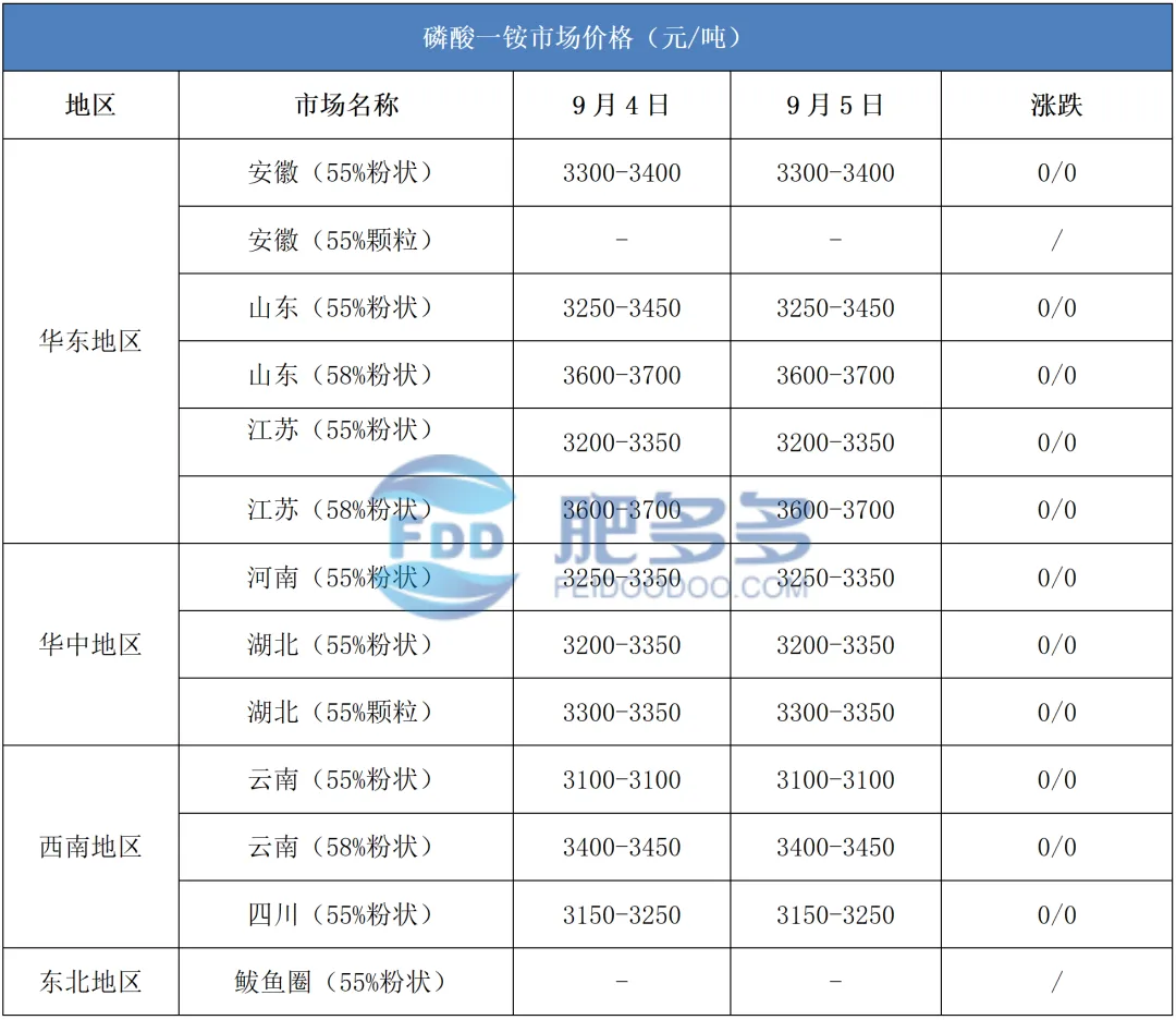 据肥多多数据测算:9月5日,国内磷酸一铵55%粉状指数为3225.00,平稳;55%颗粒指数为3350.00,平稳;58%粉状指数为3583.33,平稳。