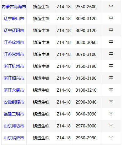 4月13日华中市场铸造 生铁价格稳,Z18林州3030,黄石2980-3010,郴州2850,现款含税。(元/吨)4月13日东北铸造 生铁报价稳,鞍山3090-3120、辽阳3090-3120元/吨,现款含税。4月13日西南铸造 生铁价格稳,Z18报2880-3150元/吨,现款含税。4月13日西北铸造 生铁价格稳,乌海2550-2600新疆2800甘肃2800包头2700,现款含税(元/吨)。4月13日华中地区炼钢 生铁价格下调20元/吨,安阳2630元/吨,大冶2560元/吨,现款含税。4月13日西北炼钢 生铁报价稳,宁夏2500包头2500甘肃2650,现款含税。(元/吨)4月13日华北地区铸造 生铁价格个别下调,Z18武安3180-3210元/吨,临汾3160元/吨。4月13日华东市场炼钢 生铁报价稳,主流报价2700-2920元/吨,现款含税,一单一议。4月13日华北地区炼钢 生铁报价稳,唐山2610元/吨。4月13日华南地区炼钢 生铁价格稳,广东地区L8-L10报2600元/吨,现款含税。4月13日华南铸造 生铁价格稳,Z18广西3020,高州3060,阳江3060,现金含税。(单位:元/吨)扫码加入生铁废钢交易群想要了解更多价格行情,就上铸材行情