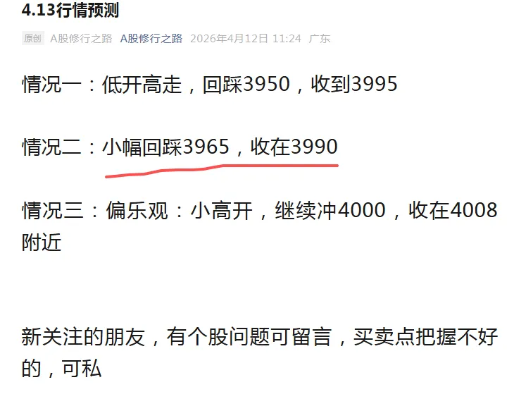 很多新朋友手中个股不知道怎么操作,都可以私我,特别是新朋友,可以留言。个股的解读还是比较准确的,对于大盘今天的红盘是意料之中,昨天的三种情况都是看涨收盘的。情况一:继续回踩3960附近,之后拉升,收在3995附近