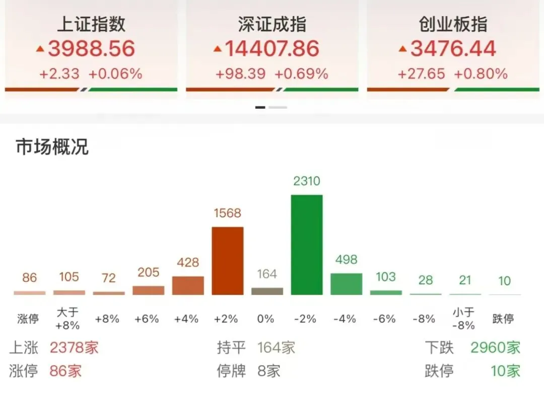 市场震荡拉升,三大指数集体收红,创业板指盘中涨超1%,续创阶段新高。沪深两市成交额2.14万亿,较上一个交易日缩量1725亿。盘面上,局部热点反复活跃,全市场个股跌多涨少,但仍有86只个股涨停。从板块来看,储能方向集体走强,宁德时代创历史新高,盘中A+H股市值突破2万亿,纳百川20CM涨停,圣阳股份3连板。锂矿概念爆发,国城矿业涨停创历史新高,大中矿业、盛新锂能双双涨停。CPO概念表现活跃,瑞斯康达、华盛昌、泰晶科技涨停,仕佳光子、光迅科技、源杰科技、长光华芯、中际旭创续创历史新高。下跌方面,游戏板块集体下挫,恺英网络跌停、冰川网络跌超10%。截至收盘,沪指涨0.06%,深成指涨0.69%,创业板指涨0.8%。