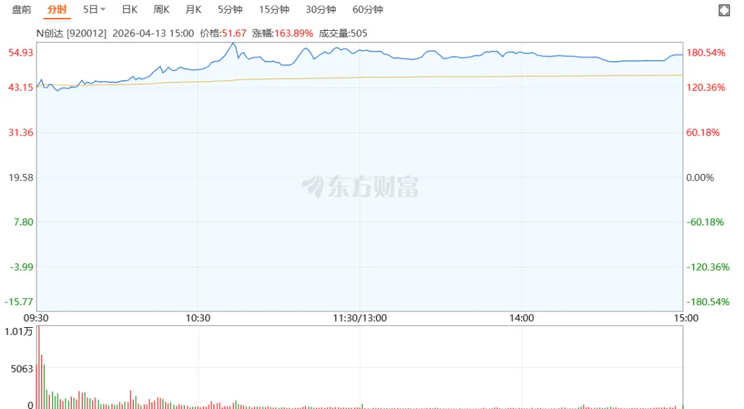早盘“新股情绪整体很好”,几乎大部分近端新股大涨普涨,创达新材也是因为感染情绪拉升到55回落,新股具体午评请关注精选号午评文章。《创达新材上市大幅冲高!(4.13新股午评)》