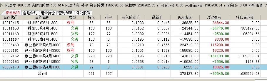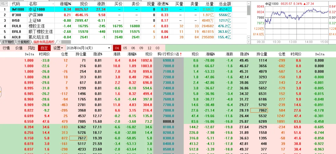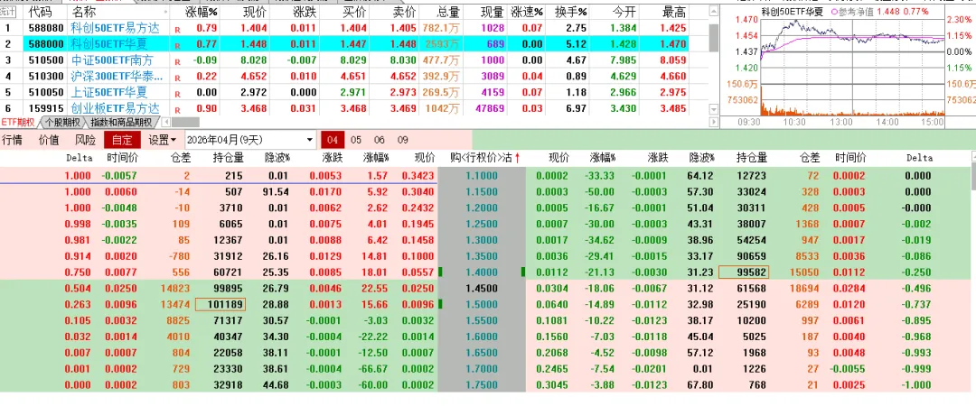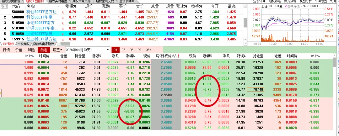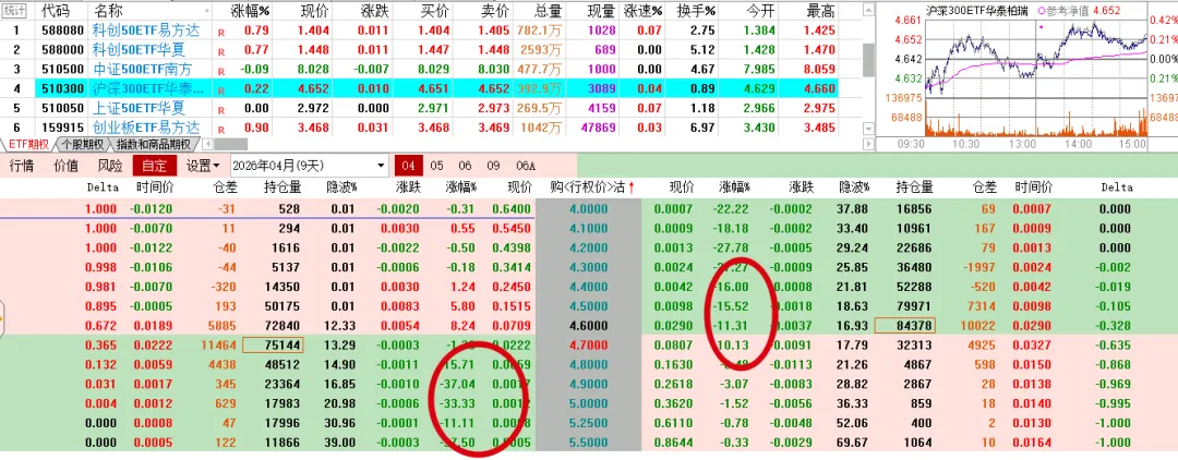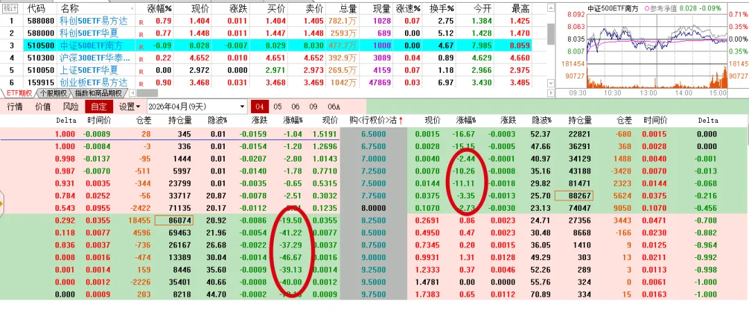 标的涨跌不一,期权表现不同,科创实值认购上涨,虚职的下跌,500双方都绿色。
