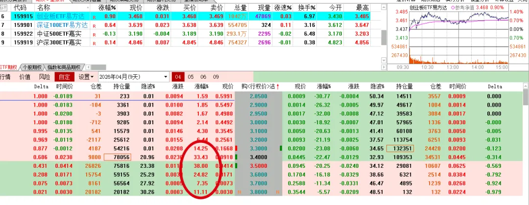 创业板因为宁德时代大涨,认购有较大涨幅,认沽大跌。