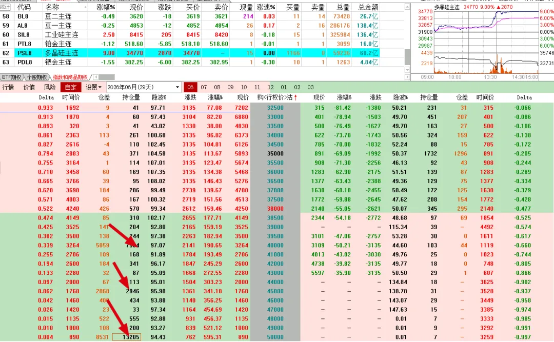 今天涨幅较大的多晶硅期权如下,这有的合约的持仓量还是很大的,比如认购4万,4万五,5万, 但我估计前面的都是卖购的吧?