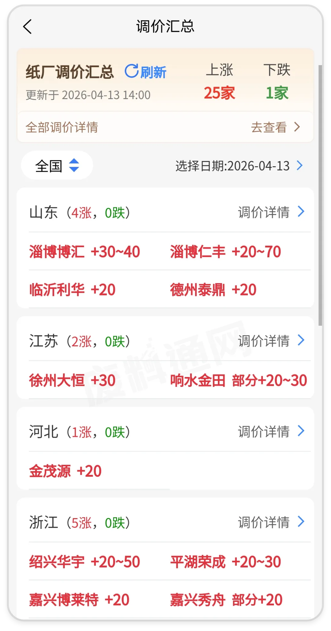 4月13日起,河南【沁阳雅都】纸业废纸在目前收购价格的基础上AA级,A级上调30元/吨。开具增值税普通发票的收购价格:AA级:1620元/吨(100%黄板,起扣1个点);起扣2个点);A级:1590元/吨(95%黄板,B级:1500元/吨(80%黄板,C级:1440元/吨(60%黄板,花纸:1360元/吨(20%黄板,起扣10个点);路补政策:运输路程超过300公里以外区域来的废纸补贴30元/吨,路补实际金额以原料预约报备小程序装车拍照北斗定位为准,必须保证车辆。北斗定位全程在线,有迹可查。(或以高速路票作证)禁止作假,一经发现严肃处理!质量要求:禁止夹带纸筒,禁止打水、夹包和加重箱!不得含有非纸类垃圾杂质和不干胶、书报广告、炮筒、酒盒、蛋托等不可利用纸。如发现恶意加水、掺假、夹包,加重扣点、降级,拆包质检及已卸货物不予退货。起扣3个点);起扣6个点);扣点信息:【安徽山鹰】从4月13日起至4月17日,B级、啤酒箱、C级、灰黄板边角料、D级、E级、三级纸、花纸、大纺线管、小纺线管、纸芯管,扣点达到2%以上减扣2%,总扣点小于等于2%按免扣结算,减扣点直接体现在纸数单价上。请悉知!4月13日起,云南【建水春秋】纸业,废纸价格上调50元/吨。调整后执行:特级1600、黄板1550、混合1500。
