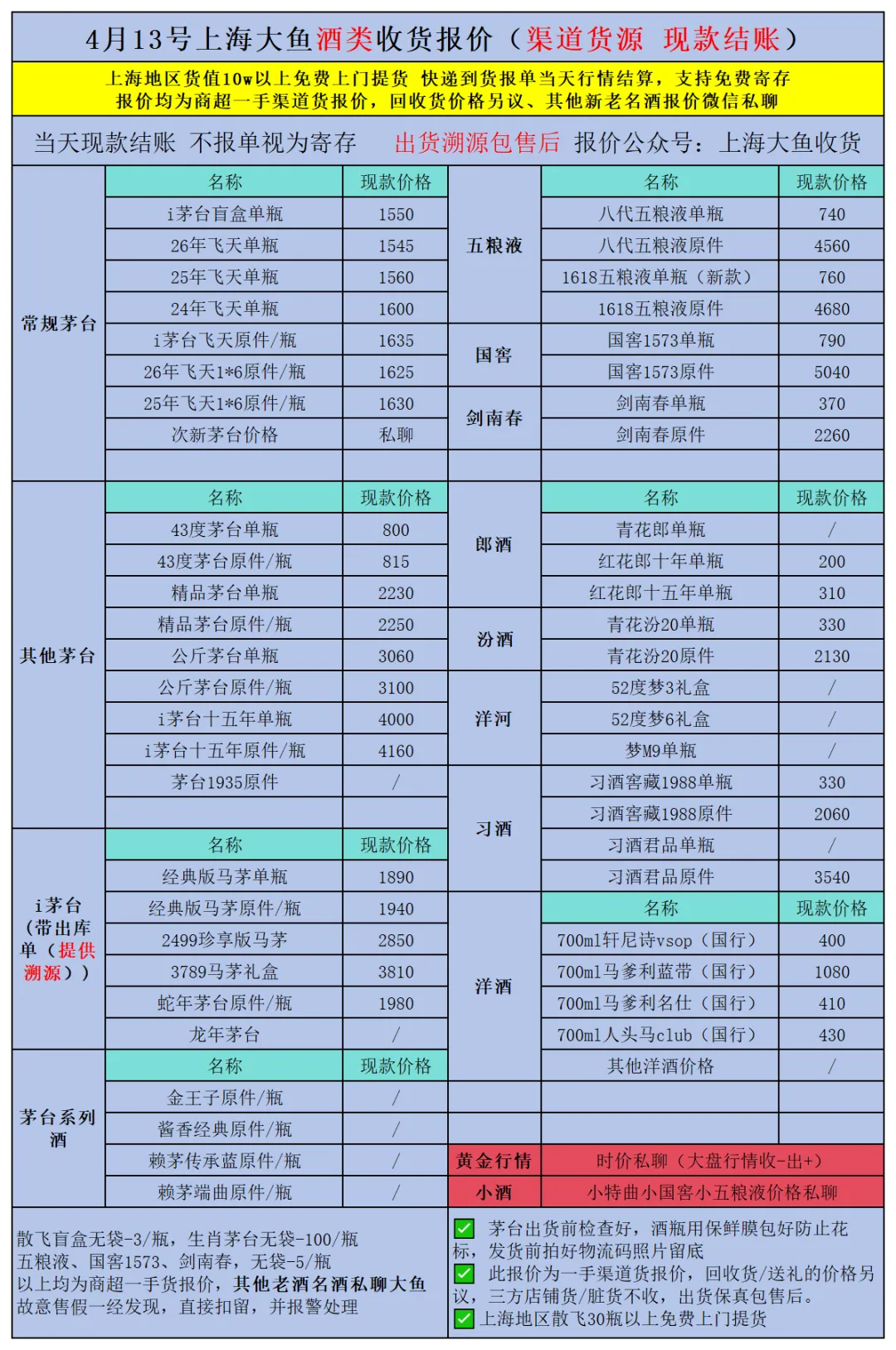 此报价为一手渠道货报价,回收货/送礼货价格另议,烟酒店回流货/三方店铺货/脏货不收,出货默认保真、永久溯源、包售后、故意售假扣货报警、不接任何国补货源