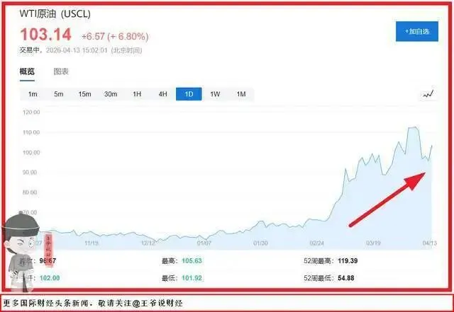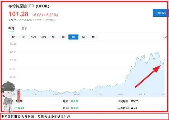 2026年4月13日,国际油价迎来史诗级跳涨,布伦特、WTI原油主力合约双双突破每桶100美元整数关口,创下2024年以来的历史新高。
