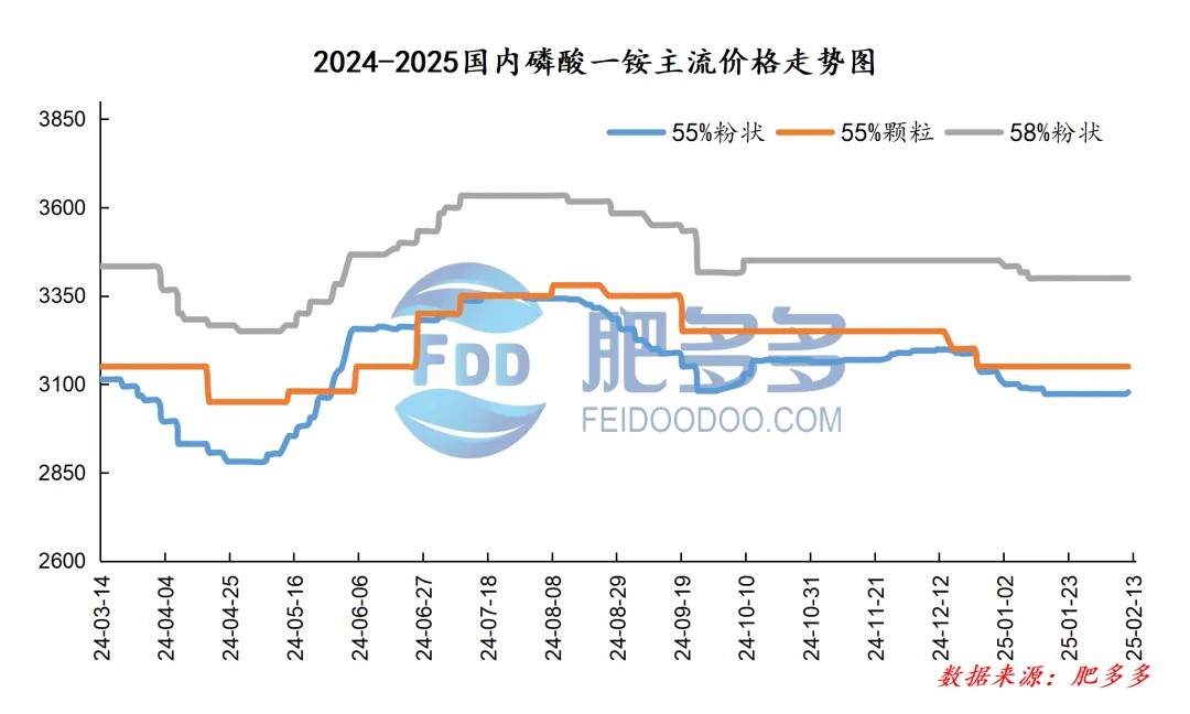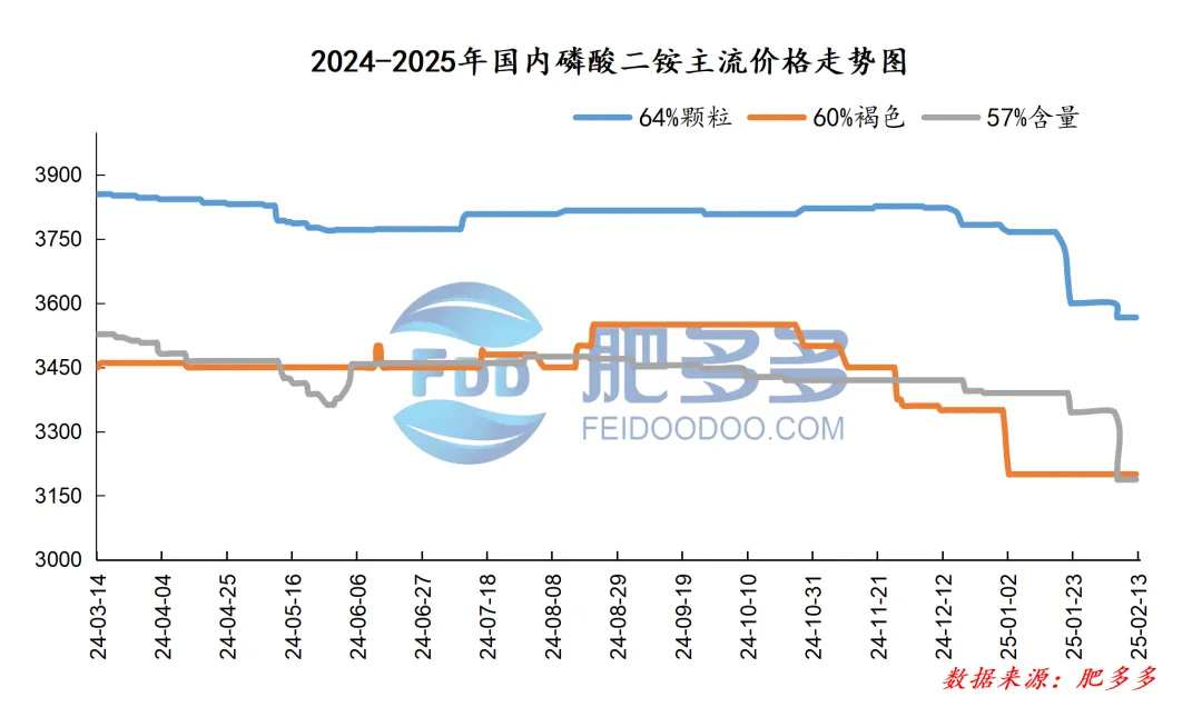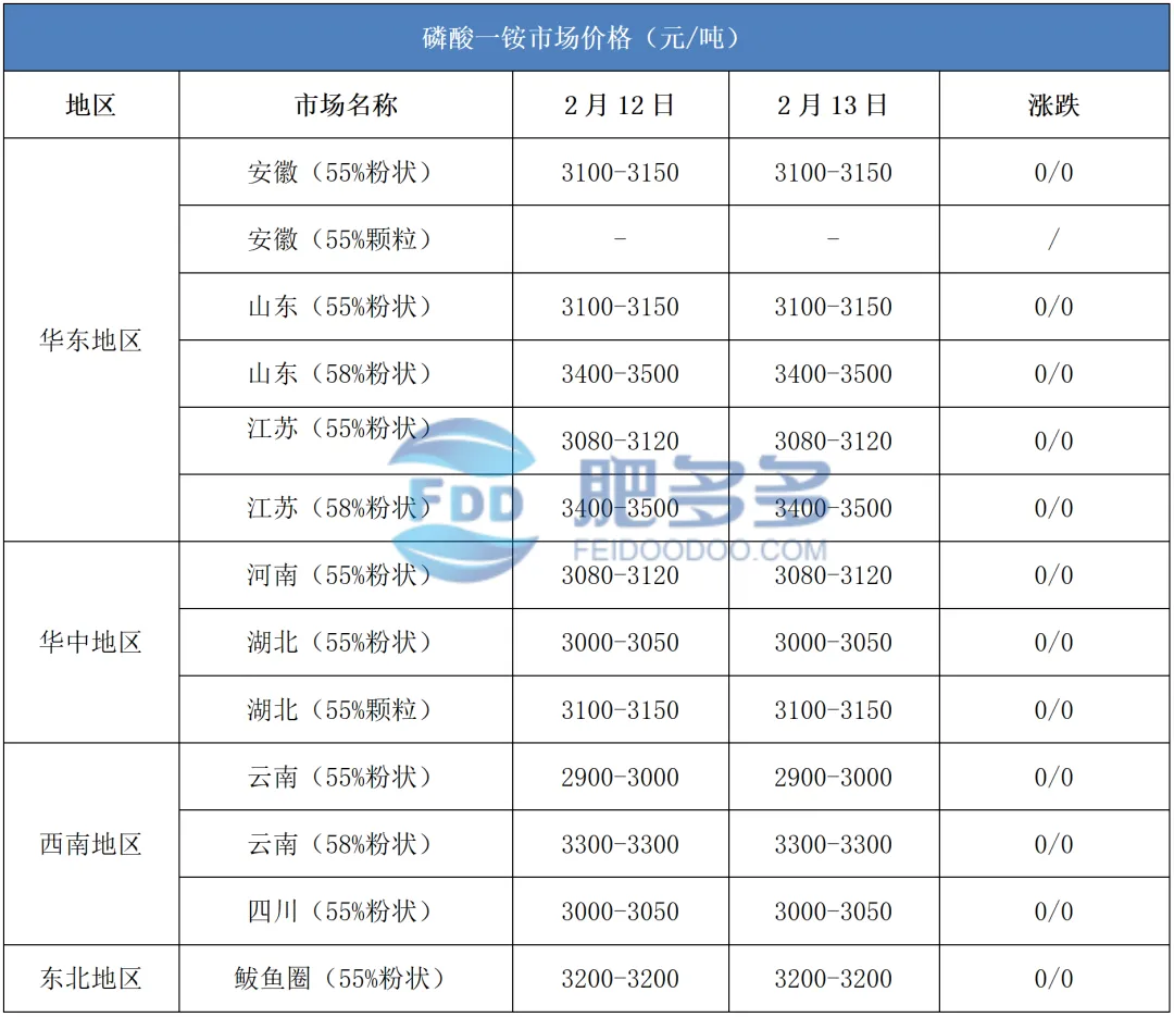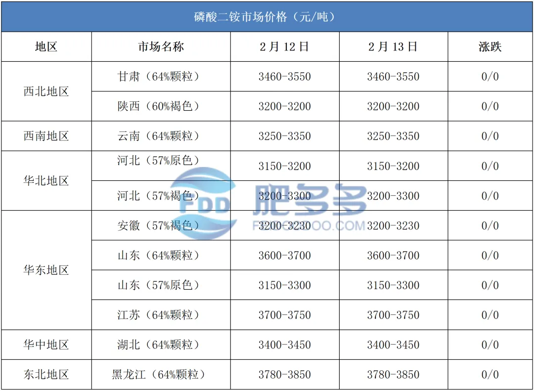 2月13日:东北地区磷酸二铵64%自提到站价3780-3850元/吨,报价维稳;57%自提到站价3350-3400元/吨,报价维稳。