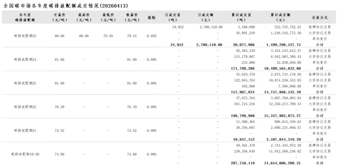 2026年1月1日至4月13日,全国碳市场碳排放配额成交量21,383,667吨,成交额1,603,147,261.35元。