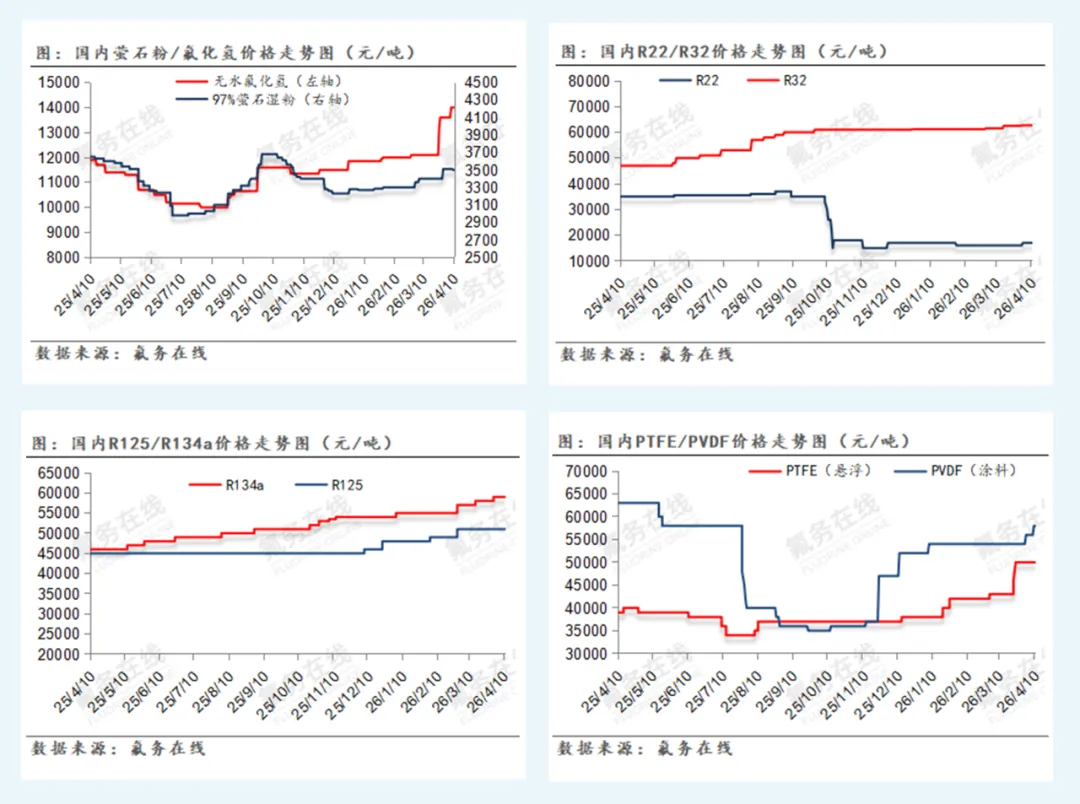 PTFE市场短期维稳运行。近期成本大幅上涨带动市场价格走高,前期企业集中发布涨价函上调报价,然下游采购积极性偏弱,对高价持观望、压价心态。虽整体成交价格尚未完全跟进企业报价,但部分散单成交已达5万元/吨,市场整体成交重心有所上移;叠加下游采购需求逐步释放,市场供需博弈有所缓和。企业报价亦随成本波动灵活调整,在成本面强力支撑下,后市预计呈温和上行走势。主流报价参考:悬浮中粒5.0-5.2万元/吨,悬浮细粉5.1-5.3万元/吨,分散树脂5.0-5.4万元/吨,分散乳液3.0-3.2万元/吨。PVDF市场行情持续回暖。受成本端压力驱动,企业纷纷上调报价,部分厂家已发布涨价函,各牌号产品价格普遍上涨15%,实际成交仍取决于下游供需博弈。上游原料涨价为企业挺价提供有力支撑,报价上调带动市场整体重心上移,散单及各牌号成交价震荡上行,市场向好趋势明确。其中涂料级、制品级价格波动较为显著,成交重心同步抬升;锂电级受储能需求释放偏缓、下游行业运行周期影响,涨价空间相对有限,但后市仍具备稳步上行潜力。主流报价参考:涂料级5.8-6.2万元/吨,制品级6.0-6.3万元/吨,锂电级5.7-6.5万元/吨。