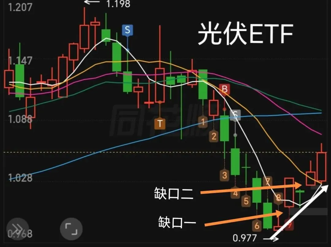4、光伏ETF华泰柏瑞(515790)在上一交易大涨1.97%,今天再次长阳大涨1.83%,已脱离底部区域,形成反转态势。但光伏在从底部上涨途中留有两个跳涨缺口。A股向来是逢缺必补,这两个缺口是近期的一个隐患,特别是近期的那个缺口。