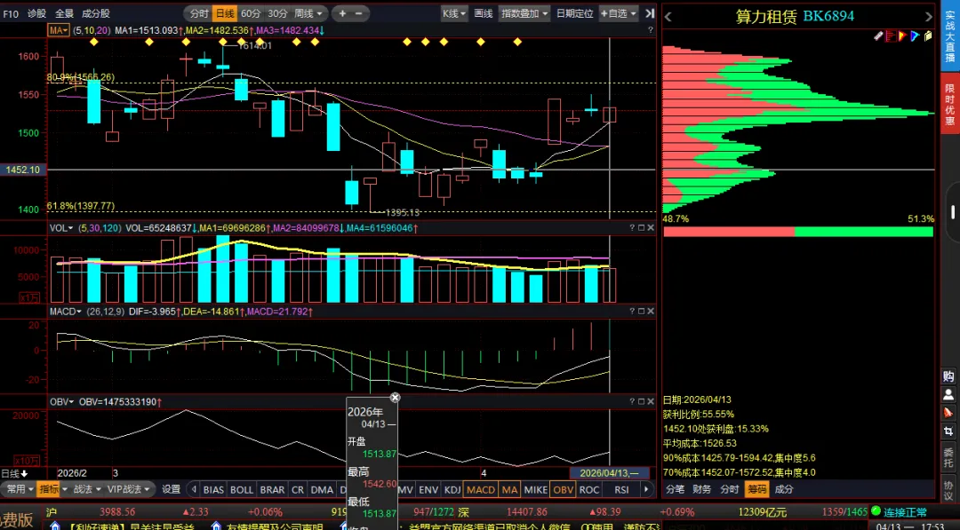 算力指数大势是属于前一波上涨趋势0.618位机构二次建仓强势类型,从一月底到今天为止,看好的一直是这个方向,虽然当时达不到板块效应的行情,但是个股标的表现确是精彩纷呈,一月份的润泽和利通,二月三月份的美丽和朗科,都有非常好的表现。