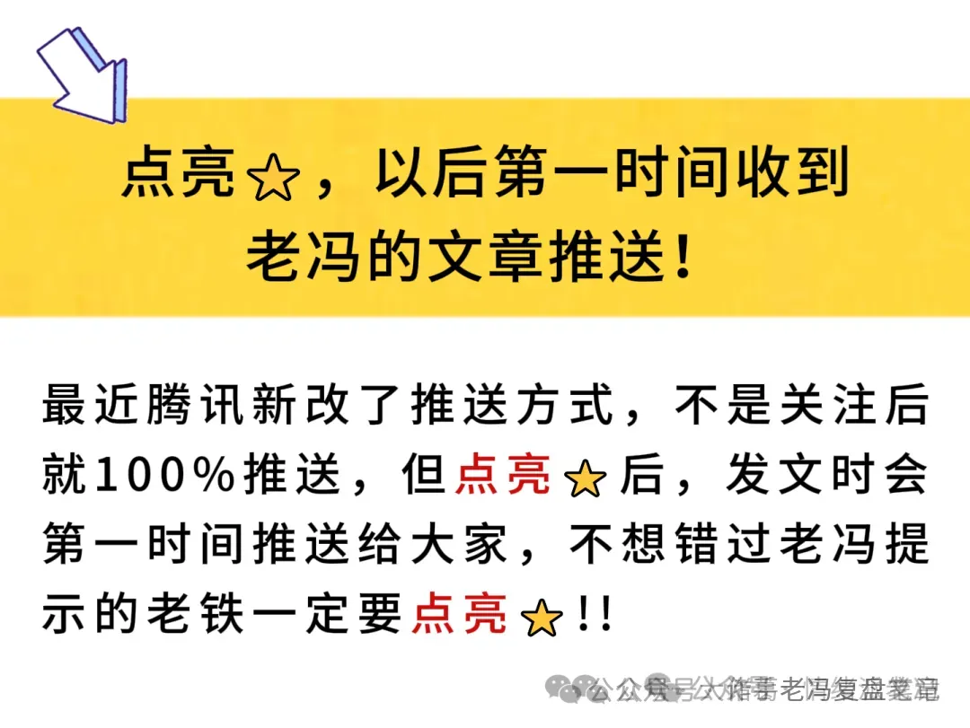 老冯每天都要用数小时精心复盘,还要给团队开会,所以有时候会比较晚,还请家人们见谅!大家阅读后,点赞、在看、留言,请务必养成阅读公众号文字版复盘打卡的习惯!如果长期点赞留言,会被系统判定为铁粉,第一时间推送文章,不然可能会收不到推送或延迟推送。