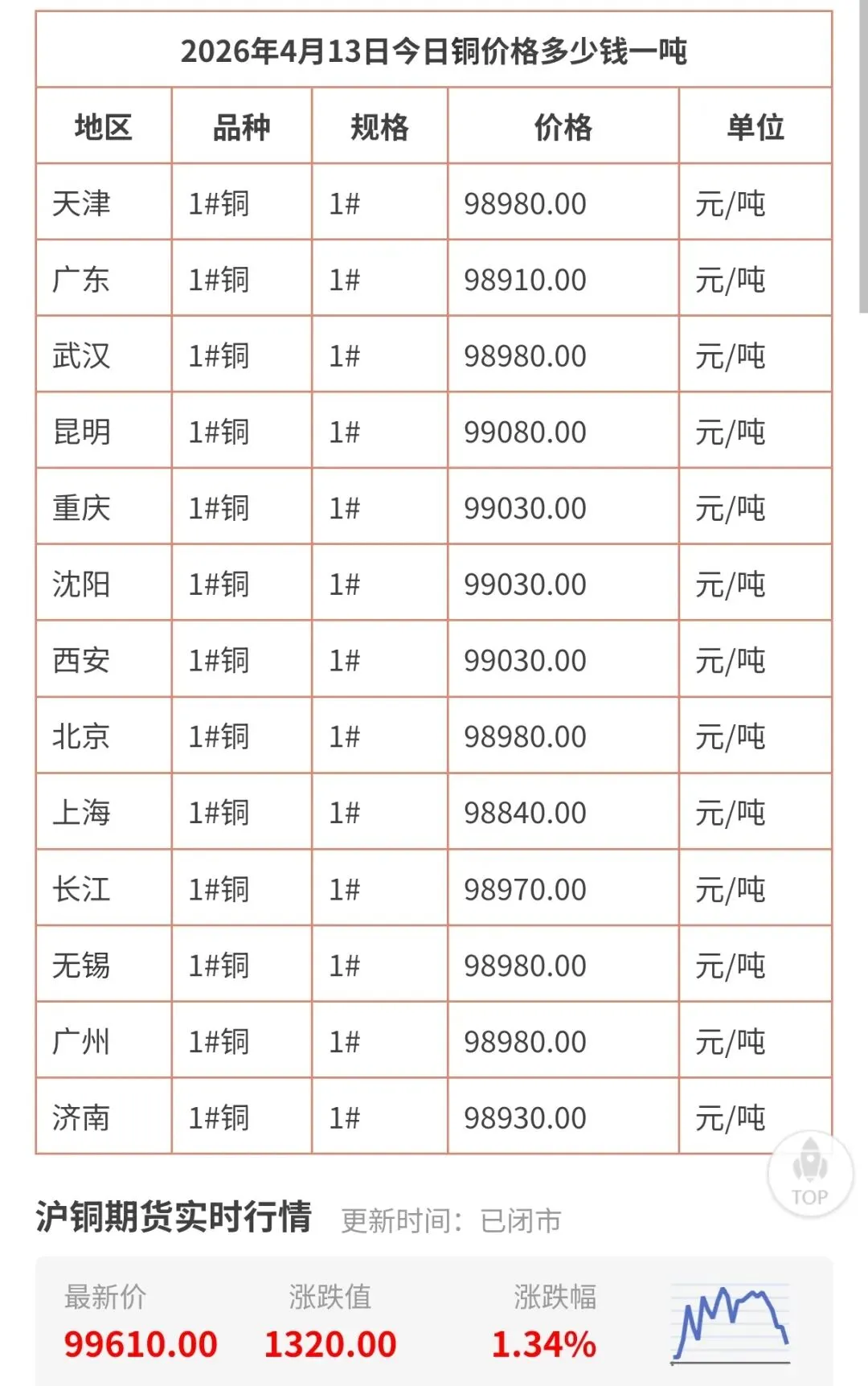 >今天铜价实时查询!现货铜价格行情走势图今日回收多少钱一斤(4月13日)