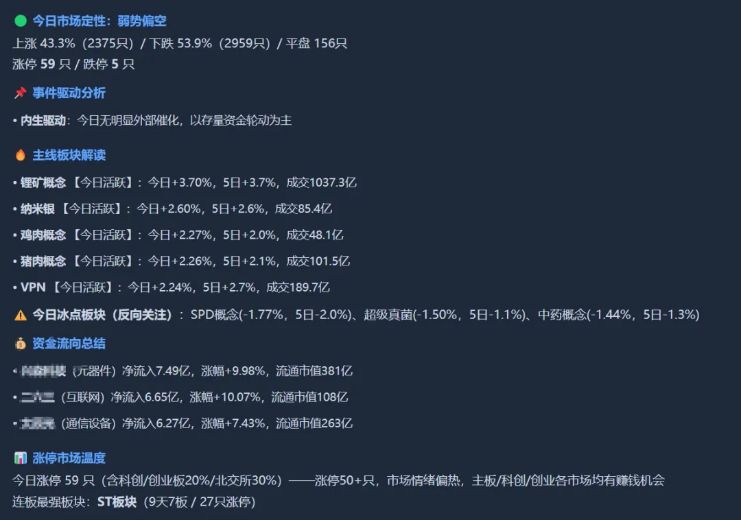 顶着和谈失败海峡两道关卡的debuff,今天靠着权重还真把指数拉出了独立行情,虽然个股涨跌数为2378:2960,但上证3988准备再攻4000关口,创业板+0.8%再创新高,可惜成交小幅缩量至2.15万亿,不利消息是缺口没解决,同时代表中军的上证和500都被30日线压制,一鼓作气再而衰,偶尔也希望外围环境能在关键位置上助力一把,要不再次闯关失败的话就又要面临尴尬的境地了。 板块方面主线还是能源大核,电池电力锂矿一个也没少,资金在业绩+地缘+创业板的叠加态下,其实选择也不多,消息驱动方面南非口蹄疫1型周末比较吸睛,目前暂时无法界定程度,风险在于隐蔽性高+首次入境,控制则在这次反应相当的迅速,迅速到疫苗股都没反应过来,且相较于其他型,1型对猪的影响程度较小,所以话说回来还是猪周期的人气使然,猪价嗷嗷跌,那边都开始幻想头部抗疫效应和蛋白替代了,多说一嘴看看鸡蛋不好么。 存储和光继续受外盘联动效应,个别核心半导体个股也保持红收,但是早盘一波冲高回落有点伤人,主要还是板块轮动的影响,成交量有限同时也有畏首畏尾的情绪,只要一点风吹草动就先暴力砸盘为敬,比如今天的宫斗之于游戏,所以整体来看市场还是相对脆弱,还需要假以时日稳固筹码和军心,正所谓调调更健康。 期货这边成交量继续小幅萎缩,受此影响内盘非常平淡,但,当大家走神的时候广期它就又来了,多晶硅在3个月走出腰斩价格,今天午后突然依靠小作文强势封板,连带着场内光伏也联动走了一波,闭门会挺价这种事以会议纪要的方式流出来,就是薛定谔的决定,只有辟谣无法证实证伪,低位纯靠臆想还是有难度,好在前期空头盈利足够充足,一时半会不会有强平导致的流动性匮乏,建议谋定而后动,机会多的是。 原油化工则完全走出了一副脱敏的样子,你外盘爱干嘛干嘛,爷们不伺候了,明天原油期权到期日,不知道会不会有联动末日期权拉升的局,觉少的晚上可以看看新闻和盘面,多少会有点蛛丝马迹。 消息面上除了锁上加锁,就是一系列化工品涨价,暂时没有什么更多的逻辑,只要地缘冲突的烈度不再升高,咱们走独立行情的机会还在增大,尤其是以全球替代的角度全军出击,资金总还是需要在场子里创造波动和收益的,今天就这样~解散~风险提示:本文所引用的观点和分析是在特定情况下,基于一定假设条件的分析和判断,不代表适合所有市场状况,不构成对阅读者的投资建议,也不构成任何业务的宣传推介材料、投资建议或保证,不作为任何法律文件,不对任何人使用此部分或全部内容的行为或由此而引致的任何损失承担任何责任,市场有风险,投资需谨慎。