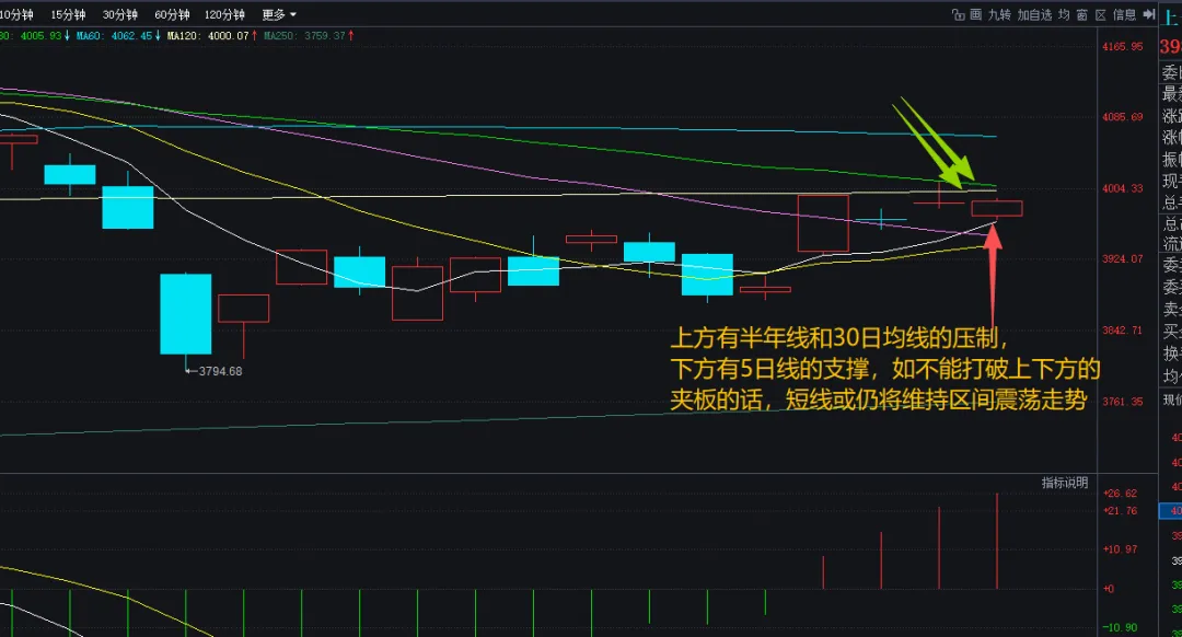 从技术面来看,上证指数目前上方有30日线和半年线的双重压制,如不能放量的话,想突破压制难度很大。下方有5日线的支撑,上有压制,下有支撑,如不能突破上下方的夹板的话,窄幅整理格局或仍将延续。