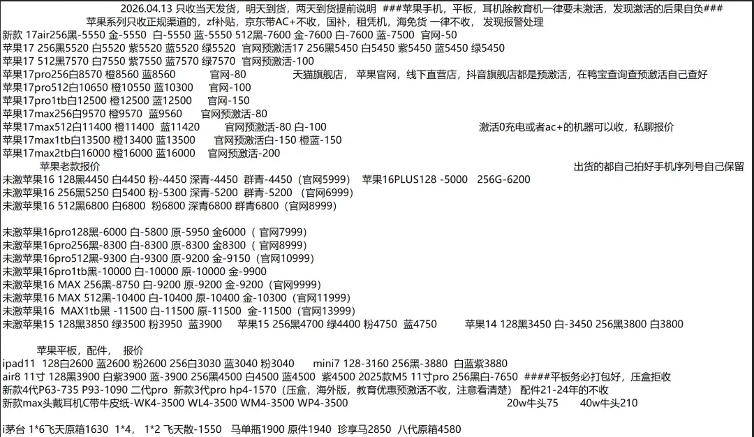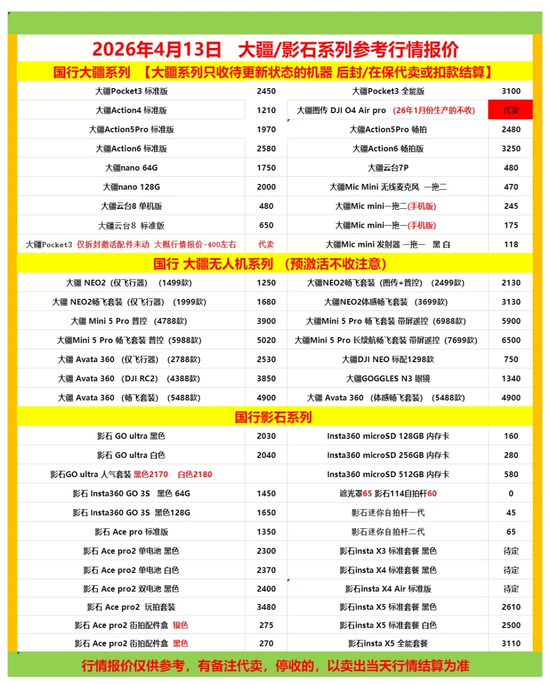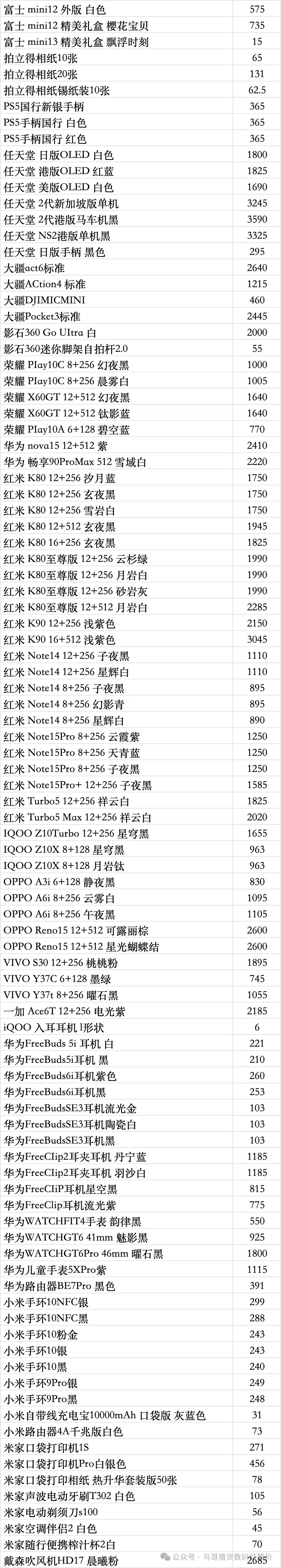 任天堂游戏机: 新款二代NS2港版标配机:3315 新款二代NS2港版马车机:3585,没游戏码:3275(注意下单要看有没有游戏码的 要不然就是便宜的) 新款二代NS2新加坡版 台版 单机:3235,就是没有游戏的 新款二代NS2韩版 欧版 美版 单机:3095,就是没有游戏的 新款二代NS2新加坡版同捆:3550,没游戏码:3210 NS2港版宝可梦同捆:3610 OLED屏 日版白-25年生产日期1790 彩色-1915,24年及之前-40 OLED屏 港版白-1750 彩色-1815 OLED屏 国行白-1645 彩色-1645 OLED屏 朱紫港版-1845 日版-1845 OLED屏 喷射港版-1845 日版-1845 健身环国行-125 海外版-325 LITE日版 港版 蓝:1005,黑粉1005,绿黄1005 任天堂日版闹钟:465 任天堂闲聊花:165 注意区分,这些就不是oled屏的 价格以下(续航版) NS续航国彩-1420 黑-1300,拆封-50 NS续航日彩-1520 黑-1460 长款-30 索尼PS5游戏机 (PS5都要留好纸箱带来,以免破坏品相) 2024新款:PS5 PRO日数:5710 2024新款:PS5 PRO港数:5910 2025新款:PS5 PRO国数:5620 2023新款ps5 日版光驱Slim:3605 2023新款ps5 日版数字Slim:3105 2023新款ps5 国行光驱Slim:老款:,2025新款3450 2023新款ps5 国行数字Slim:2955 2023新款ps5 港版光驱Slim:3655 2023新款ps5 港版数字Slim:3105 PS5国行手柄普通色:360,珠白靛青凫绿380,外版-40 PSP串流机:1395白,1395黑 PS5单国光驱:545,外版505 ROG XBOX :6730 OLED SteamDeck掌机掌上游戏机 512G 美:4530,日港:4530 OLED SteamDeck掌机掌上游戏机 1TB 美:5300,日港:5300 大疆3标准:,全能: 大疆Action4标准:,全能: 大疆ACT5 Pro标准:,全能: 大疆action5pro畅拍: 大疆AC6标准: 大疆AC6畅拍: 大疆NEO标配:,全能: 大疆OM7P:,om7: 大疆 mic1拖1:,1拖2: o4图传: 拍立得MINI12影像花室套装:,外版,一次成像礼盒装 拍立得SE国行:,白色: 拍立得相纸20张:130,10张:65 拍立得锡纸装10张:62 任天堂 手柄 NS左右手柄:345,蓝黄紫绿335 NS2左右手柄:385 NS2 PRO手柄:395 PRO黑柄:295 PRO喷射王泪异度大乱斗手柄:335 4月13行情价格更新 行情参考 大疆pk3标准2455 大疆pk3全能3100 大疆ac4标准1215 大疆ac5标准1970 大疆ac5畅拍2480 大疆ac6标准2580 大疆ac6畅拍3250 大疆nano 64 :1760 大疆nano128:2000 大疆o4pro图传代卖(26年一月份的不要) mini一拖一 手机版 175 mini一拖二 手机版 245 mini一拖二 470 【大疆系列只收待更新状态的机器 后封/在保代卖或扣款】 影石acepro一代1350 影石go3s 64 黑白1450 影石go3s 128 黑白1650 影石acepro2单电黑2300 影石acepro2单电白2370 影石acepro2双电黑2400 影石acepro2玩拍套装3480 影石x5标准黑2610 影石x5全能3110 影石go ultra黑2030白2040 影石go ultra人气套装黑2170白2180 影石aceproPro2 街拍黑 270银 275 影石128内存卡170 遮光罩65 影石114自拍杆60 影石迷你自拍杆一代45 影石迷你自拍杆二代65 华为手表目前行情参考 华为 Watch FiT4 黑550白560绿595紫560银595 华为 Watch FIT4 pro 黑1065蓝1045绿1145 华为WATCH FIT 3 黑395灰405月光白395原野绿405粉395薄荷绿395蓝395珍珠白420 华为WATCH FIT 2活力款 黑色315粉310 Watch D2 黑 2825白2825蓝2835 药房版 2515 Watch buds 黑1125卡其色 1225 Watch 5 46m 黑1780紫2145棕 2205蓝1880钛空银 2445 Watch 5 42m 黑1695白1825杏2235绿1675金2345 非凡2 黑4825蓝5845 非凡手表 黑3025 华为新款WATCH GT6系列 GT6 pro 黑1800棕2135钢2545 GT6 46m黑 1095灰色 1245绿色 1375 GT6 41m 黑 935棕色 1225白色 1240紫色1015蓝985青1010 华为新款WATCH GT5系列 GT5 46黑1005蓝935棕850灰860 GT5 41 黑 895蓝760白850青795棕735 GT5pro 黑1085陶瓷2075钛钢色 1350冰川白975 华为儿童手表系列 儿童4pro蓝485粉490 儿童5pro 蓝740粉740绿735紫755 儿童5X 蓝690粉705 儿童5Xpro 黑1045紫1120 儿童5 绿365紫365蓝415活力蓝355红335 儿童5星耀 粉430蓝430 荣耀,华为手环 荣耀手环9标准黑93蓝100紫100 荣耀手环9NFC 黑120蓝120紫120 荣耀手环10标准黑140绿138灰138蓝140 荣耀手环10NFC 黑155灰155绿155蓝150 华为手环系列 华为手环8标准黑103粉105 华为手环8NFC 黑110 华为手环9 黑135白125粉125 华为手环9nfc版 黑145白135粉135 华为手环10标准 黑159粉159 华为手环10铝合金款 黑159白160蓝160紫163向新绿155原野绿150灰150 华为手环10NFC 黑183白185蓝187紫187绿187 华为手环11 标准版 羽砂黑 203流光紫 200 华为手环11 铝合金版 羽砂黑 215星云杏220流光紫220悦动白220草木绿 220 华为手环11 NFC版 羽砂黑 240星云杏 245流光紫 245悦动白 245草木绿245 华为手环11pro NFC版 羽砂黑 290海岛蓝290原野绿290 B7 黑650灰665 华为耳机系列 华为Free Arc 绿405灰415黑415白405 华为 FreeBuds 7i 白338灰333粉343 华为freebuds6i耳机 白255黑250紫260 华为耳机Free clip2 黑1200白1185蓝1185金1200紫1210 华为耳机Free clip 黑色815暖星云845紫 775玫瑰金780 华为耳机FreeBuds 5i 黑208白218蓝218 华为FreeBuds se2 耳机 白72蓝73黑73紫73 华为 FreeBuds se3 黑100金100白100 华为 FreeBuds Se4 白128黑127 FreeBuds 6 白485黑490紫490金485 FreeBuds 4e 2024款 白295银295 FreeBuds pro5 白1045银1070金1060蓝1070 FreeBuds pro4 黑665绿680白680 华为CD56 pro笔 453 华为CD57 黑245白255 华为CD54S 三代笔292 华为 三代笔充电器 85 Wifi5 黑175白175青175 WiFi3 pro 270 AX3 120 AX6 new 238 AX3 pro new 185 AX3 pro WiFi7 185 BE3pro 千兆版 180 BE3pro 疾风版 170 BE7pro 388 BE7 335 AX2pro 99 荣耀手表 荣耀手表x5 白255黑255 荣耀手表x5i 白143黑143 荣耀手表5pro 蓝牙版黑1095灰1085 荣耀手表5pro 插卡版黑1185灰1185 荣耀手表5Ultra黑1215棕1475钛金属1895 荣耀手表5 黑565金565 移动电源 华为22.5w se 移动电源 黑85白88 华为66w 电源 白178蓝180 |