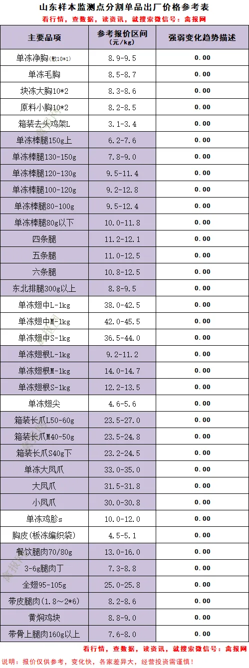 (2)辽宁地区:a、统一明面报价保持稳定,主流价格3.80-3.85元/斤;b、毛鸡供应面继续趋紧,多点收购有缺口,顺势减停产情况明显;c、产品出货依旧显弱,报价多点议价明显,当前宰杀已经进入亏损状态。