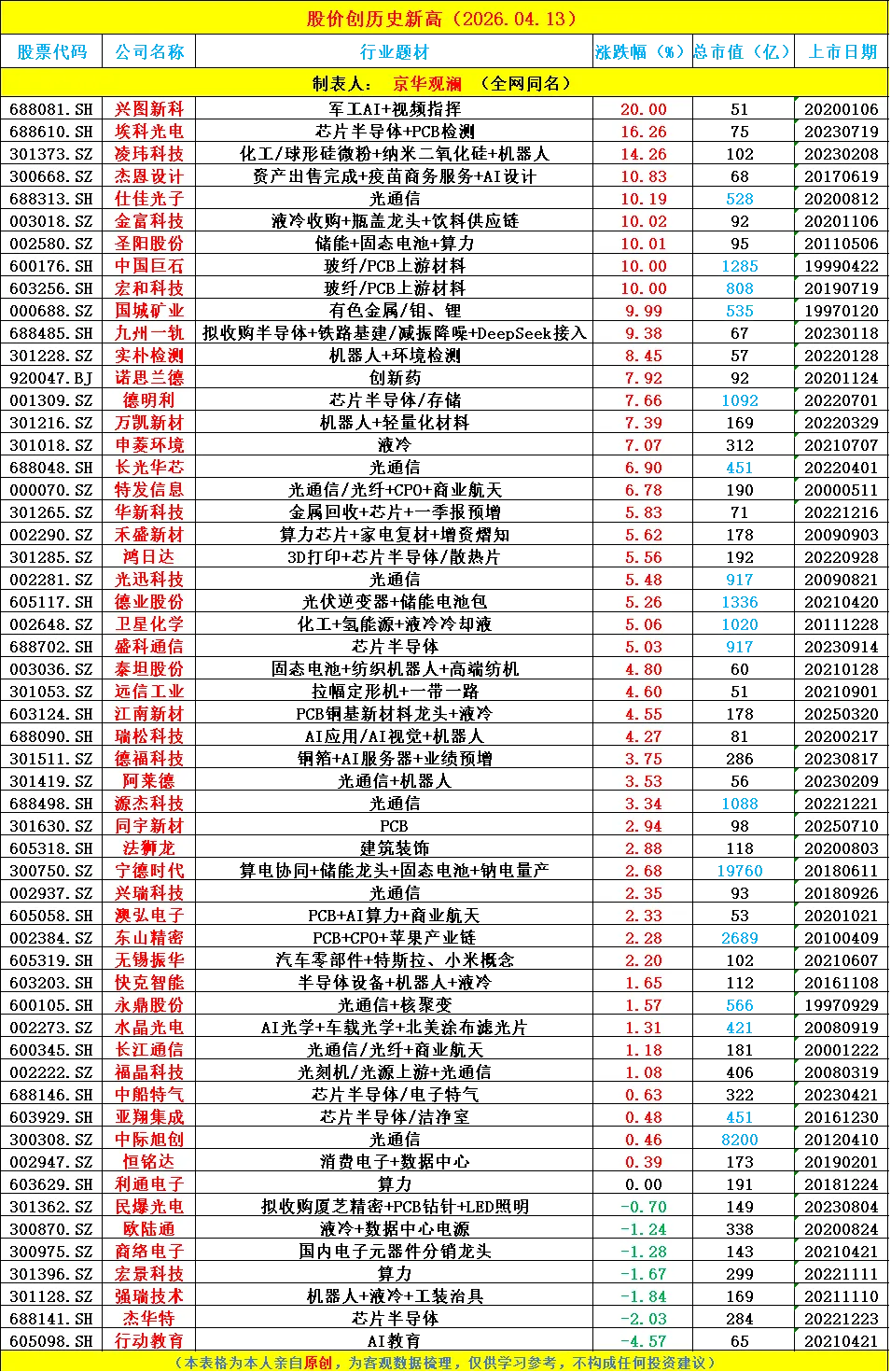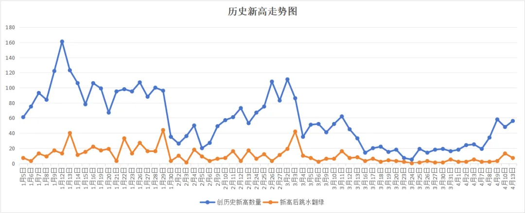 今日创历史新高个数为56个,较上一交易日增多8个,其中有7个创新高后跳水翻绿!
